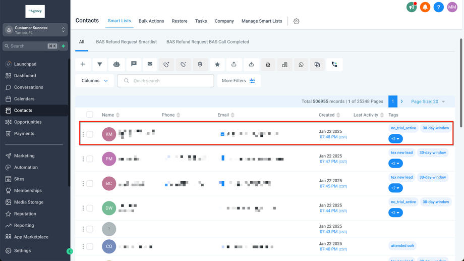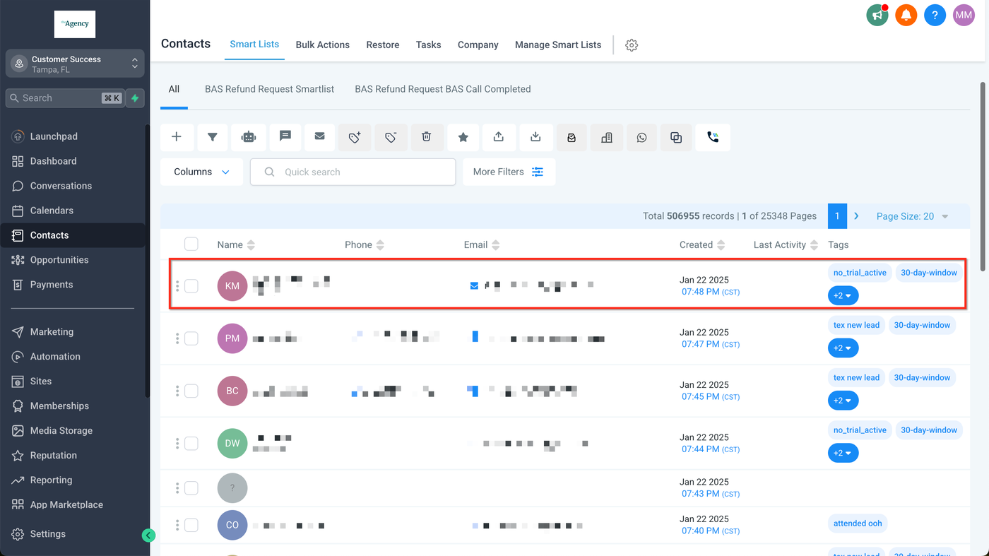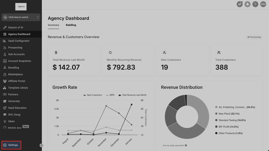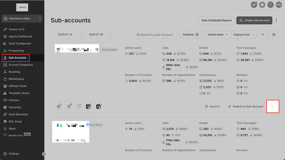 Gehen Sie zu Agentur > Unterkonten und klicken Sie im Unterkonto-Karten-Menü (drei Punkte unten rechts) auf Kunden verwalten