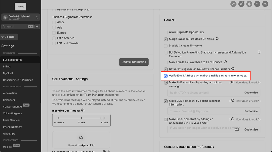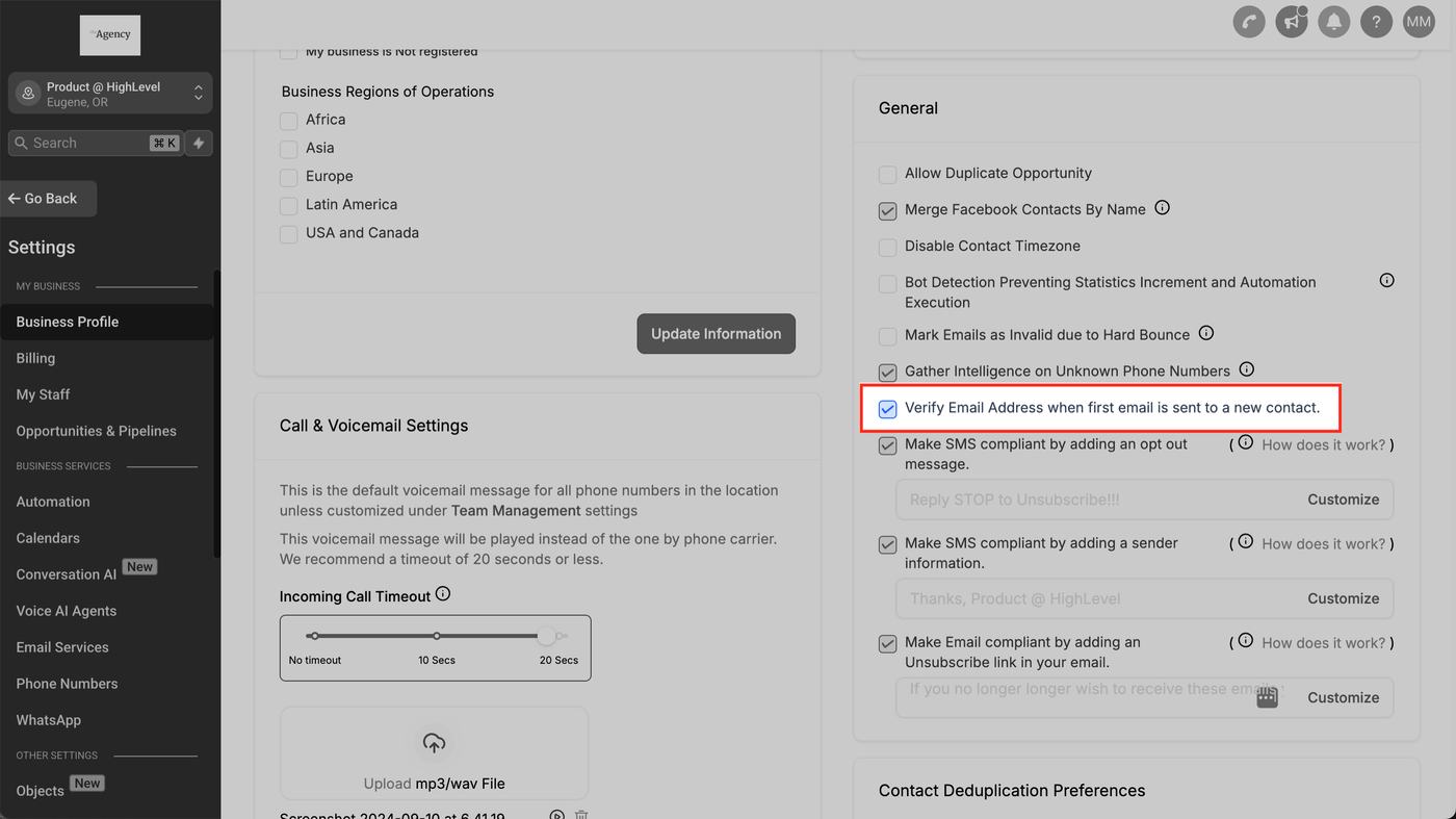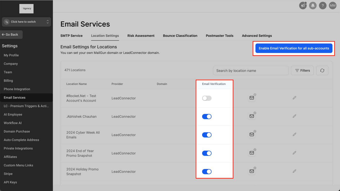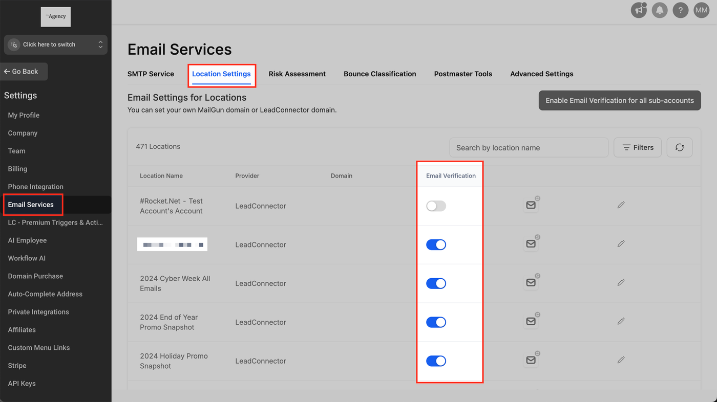 Navigieren Sie zu E-Mail-Services > Standort-Einstellungen > Spalte E-Mail-Verifizierung
