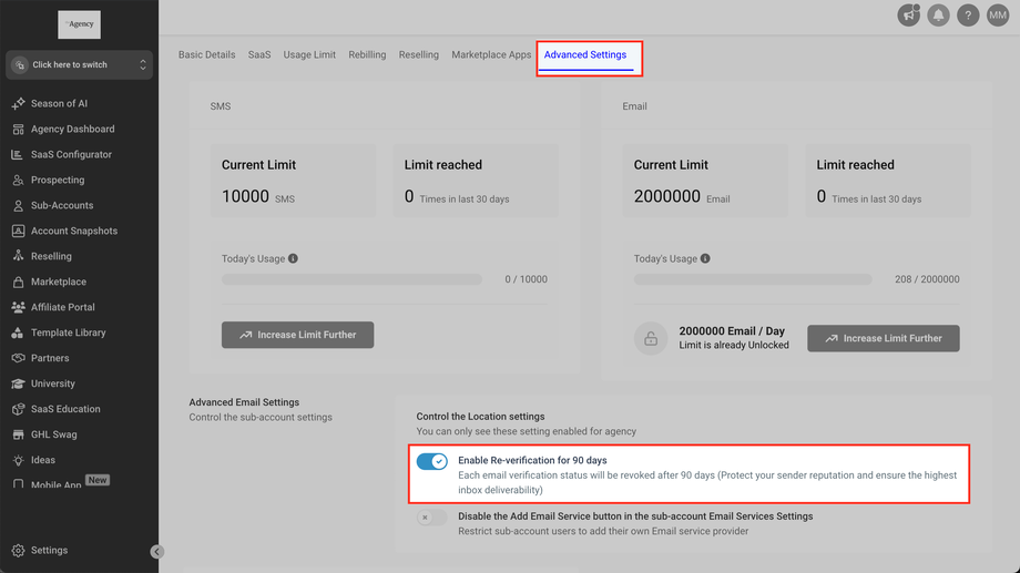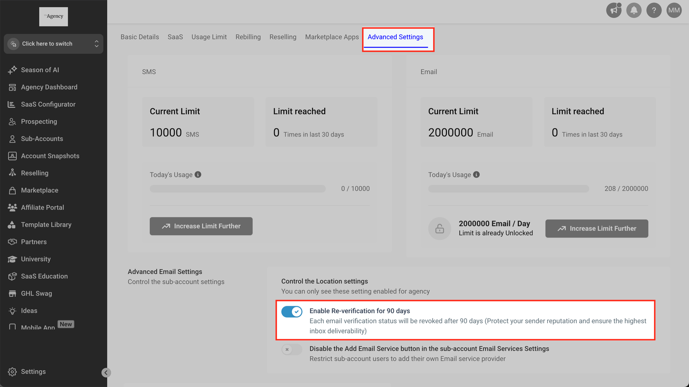 Navigieren Sie zu Erweiterte Einstellungen > Erweiterte E-Mail-Einstellungen und aktivieren oder deaktivieren Sie „Re-Verifizierung alle 90 Tage aktivieren“