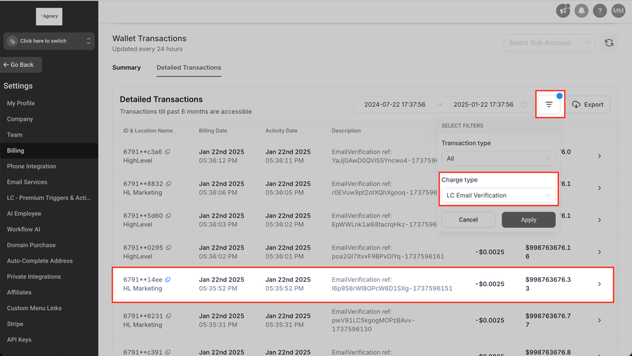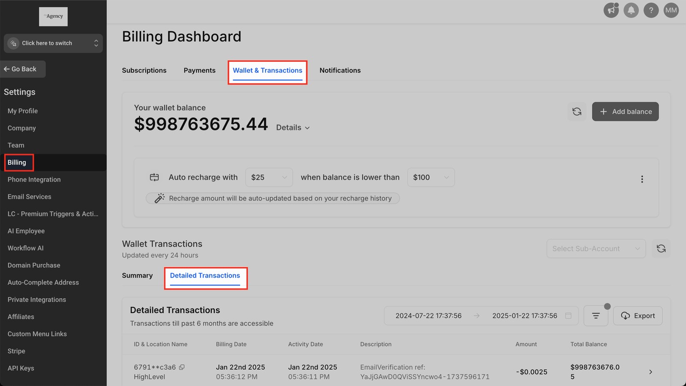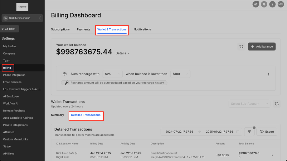 Abrechnung > Wallet & Transaktionen > Detaillierte Transaktionen