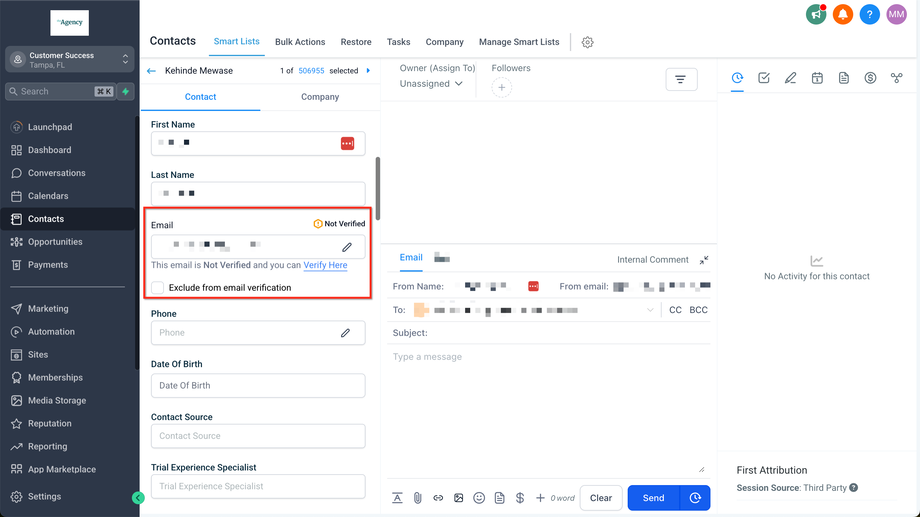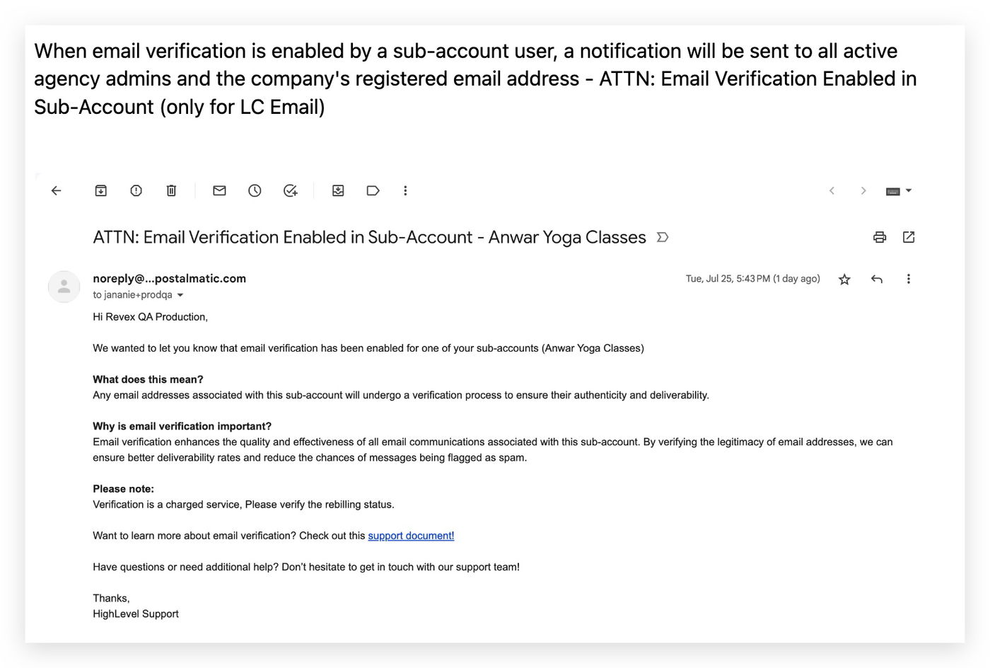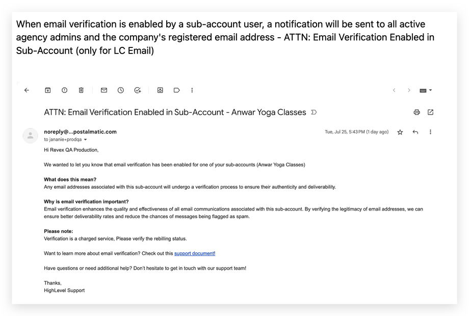 Wenn die E-Mail-Verifizierung durch einen Unterkonto-Benutzer aktiviert wird, erhalten alle aktiven Agentur-Admins und die registrierte Unternehmens-E-Mail-Adresse eine Benachrichtigung: „E-Mail-Verifizierung im Unterkonto aktiviert“ (nur für LC Email).