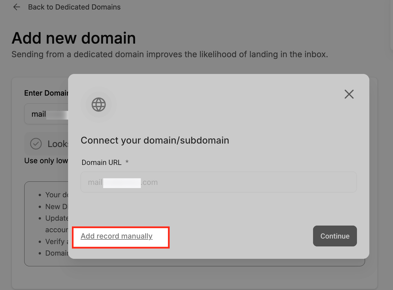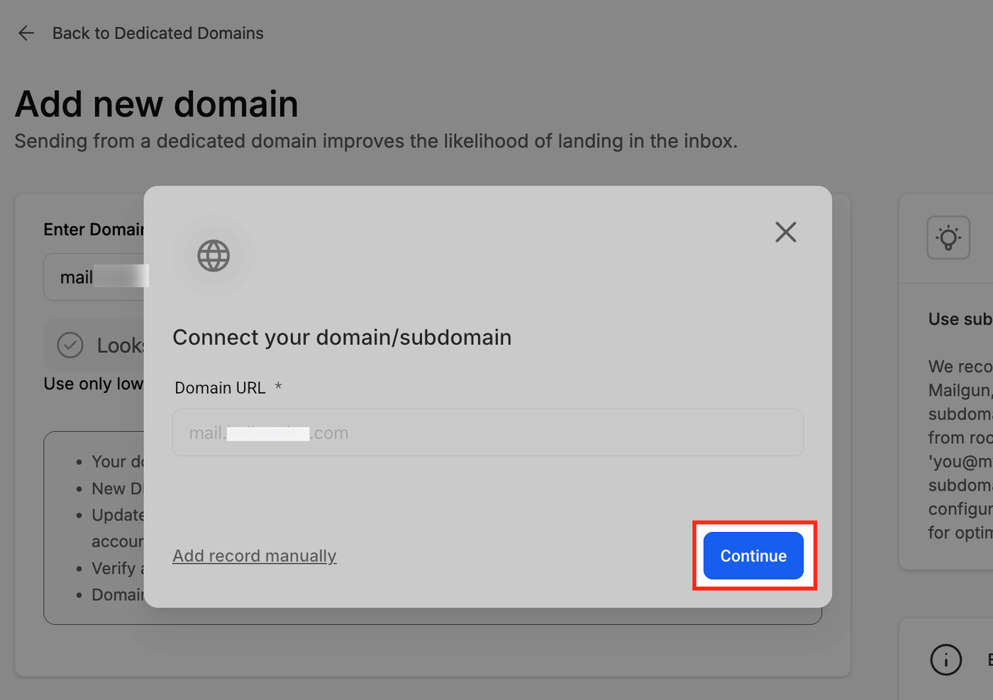 Klicken Sie nach dem Hinzufügen Ihrer Domain auf Continue.