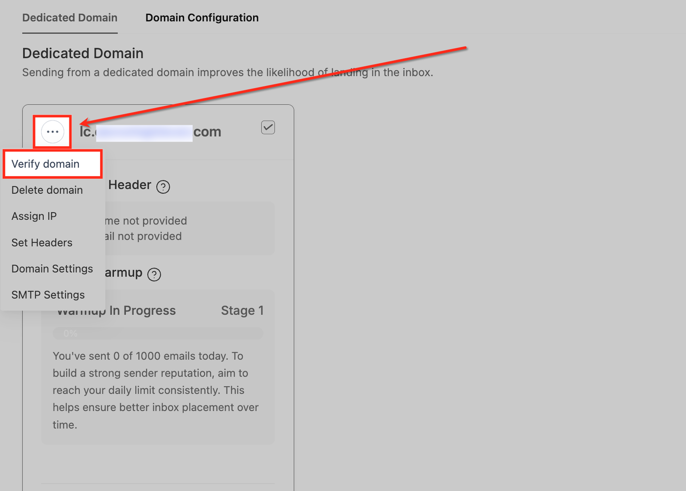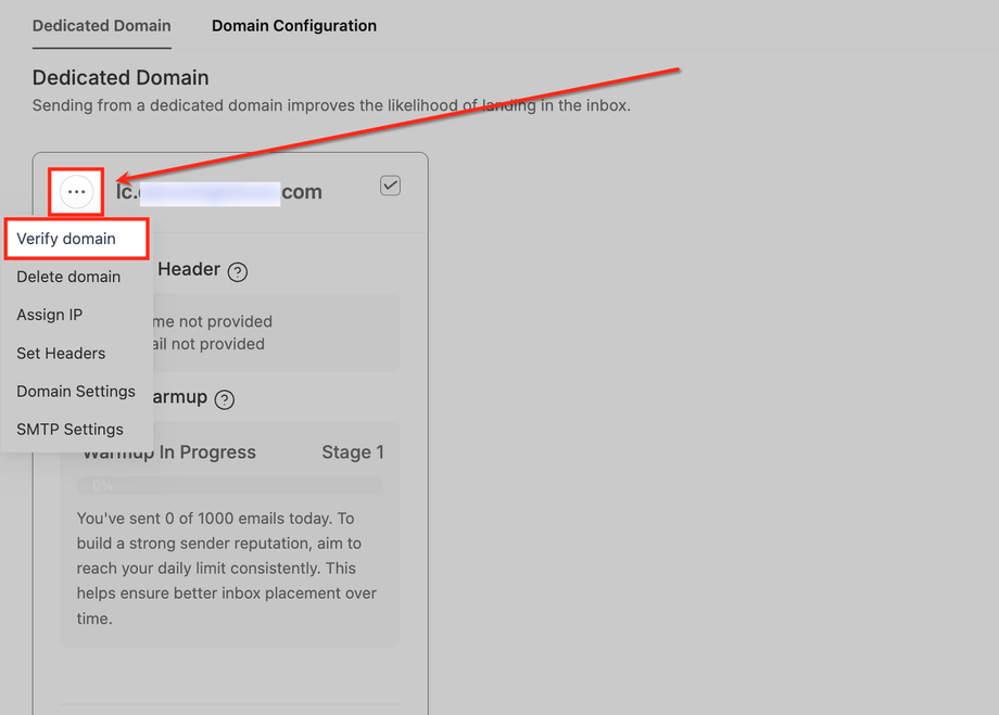 Nachdem Ihre Domain hinzugefügt wurde, können Sie über das Drei-Punkte-Menü daneben auf Verify domain klicken.