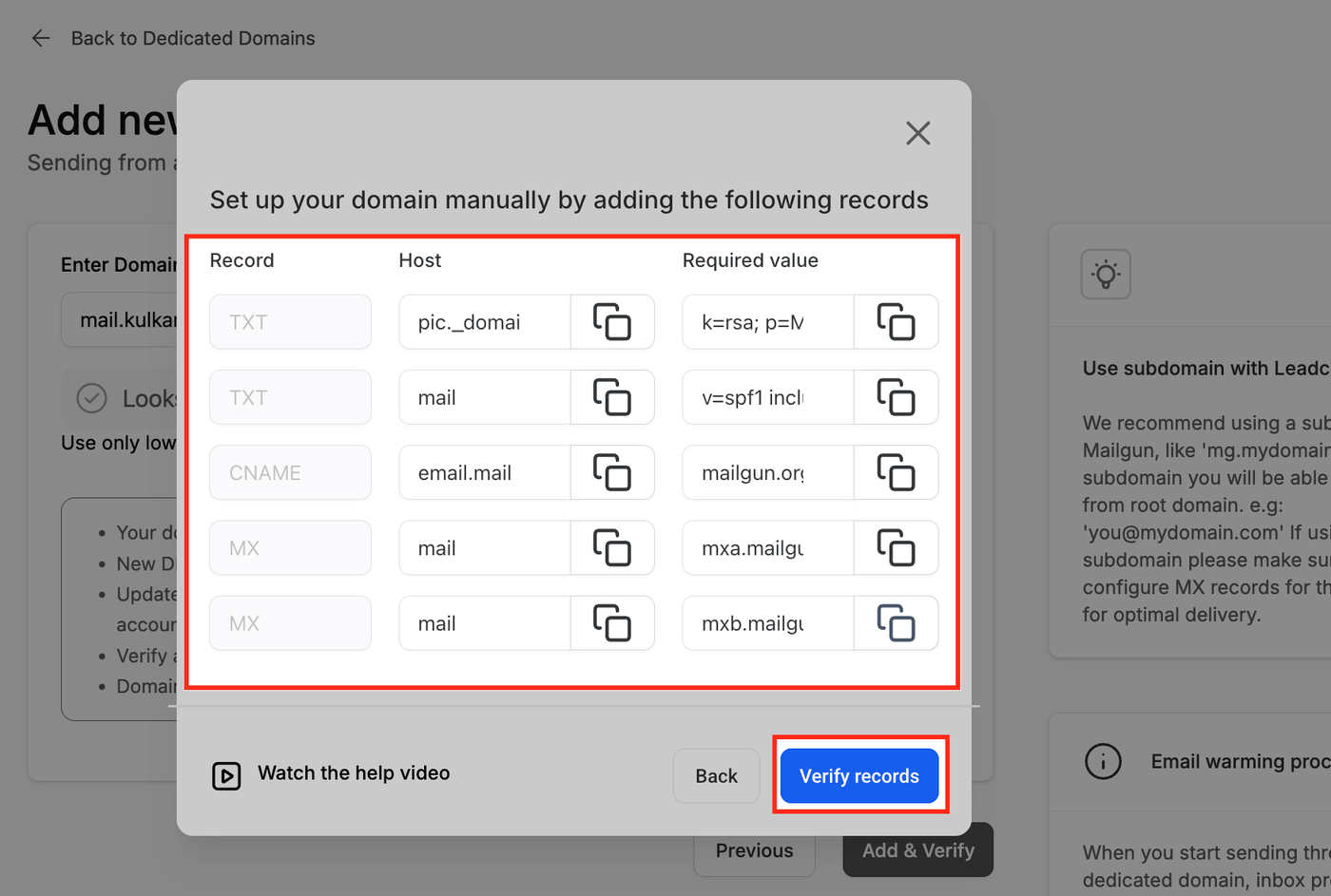 Nachdem Sie auf Verify domain geklickt haben, sehen Sie eine Liste aller DNS-Records, die Ihre Domain benötigt (SPF, DKIM, CNAME, MX und DMARC).