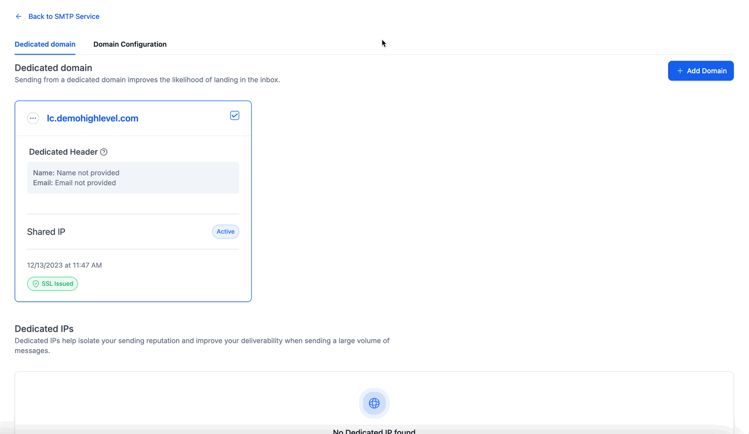 Klicken Sie auf Domain hinzufügen, um Ihre Versand-Domain zu konfigurieren.