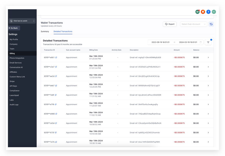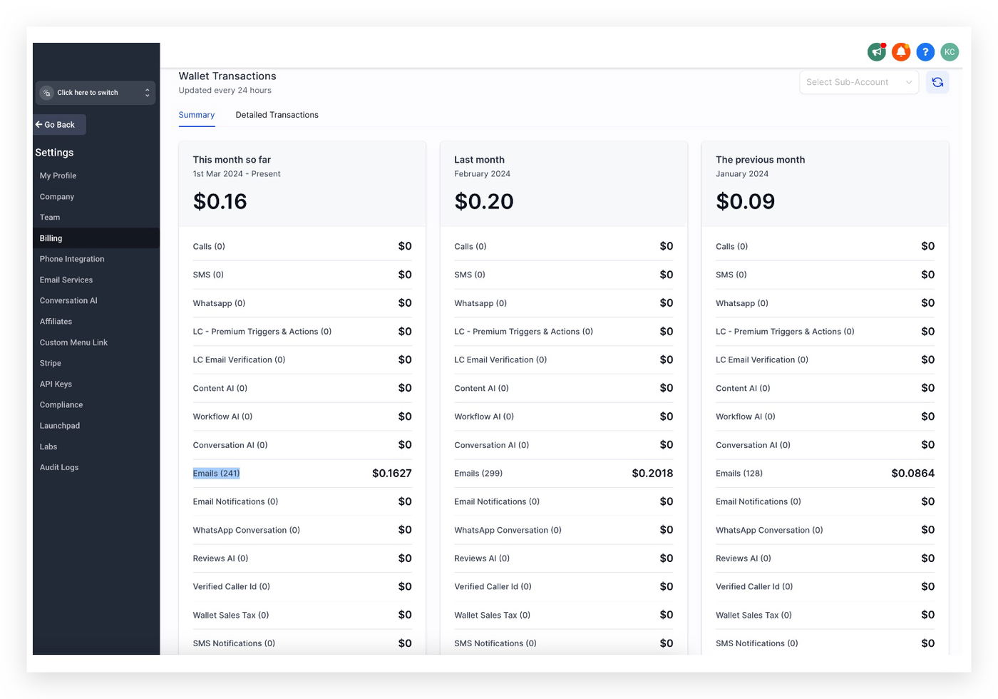 Der Preis beträgt $0,675 pro 1.000 E-Mails für alle Pläne, und die Transaktionen werden auf Agentur-Ebene detailliert: