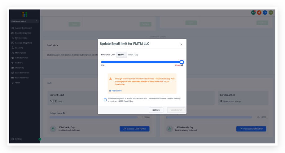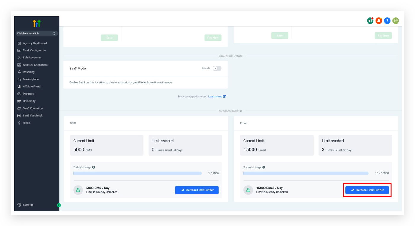 Shared IP Versandlimit: 250 bis 15.000 E-Mails (Zur Erhöhung muss ein dediziertes Sende-Domain für das Unterkonto eingerichtet werden)