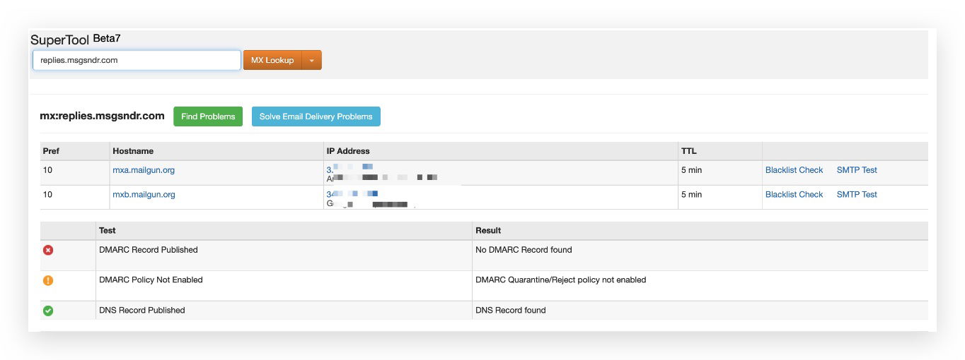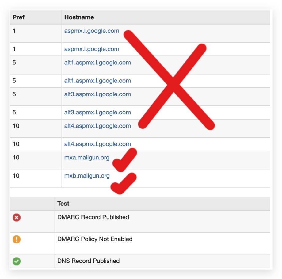 Wenn Sie mit MX Toolbox den MX-Eintrag für die Root-Domain prüfen und er sowohl auf Mailgun als auch auf andere E-Mail-Server (z. B. Google Workspace) zeigt, muss entweder eine Subdomain für Mailgun eingerichtet oder die Domain nicht für andere E-Mail-Server genutzt werden.