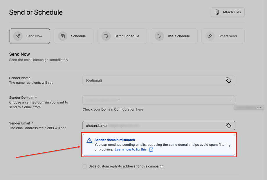 A: Warnungen erscheinen, wenn ein potenzielles Zustellbarkeitsproblem vorliegt, z. B. eine Nichtübereinstimmung zwischen Absender-E-Mail und Domain. Die Kampagne kann gesendet werden, aber die Übereinstimmung wird empfohlen, um Spam-Filter zu vermeiden.