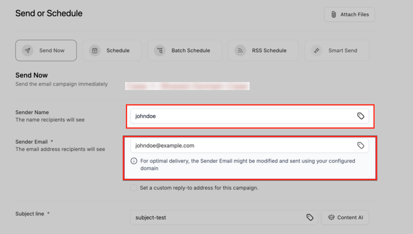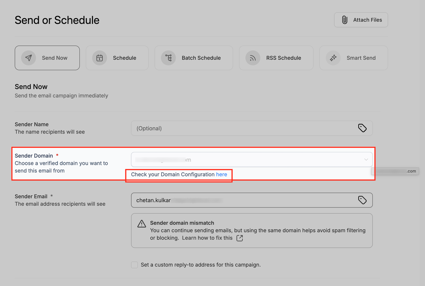 Diese Kontrolle pro Kampagne hilft, Zustellprobleme zu reduzieren und die Zuverlässigkeit des Versands insgesamt zu verbessern. Sobald eine Kampagne gesendet oder geplant ist, wird die ausgewählte Absender-Domain für diese Kampagne gesperrt.