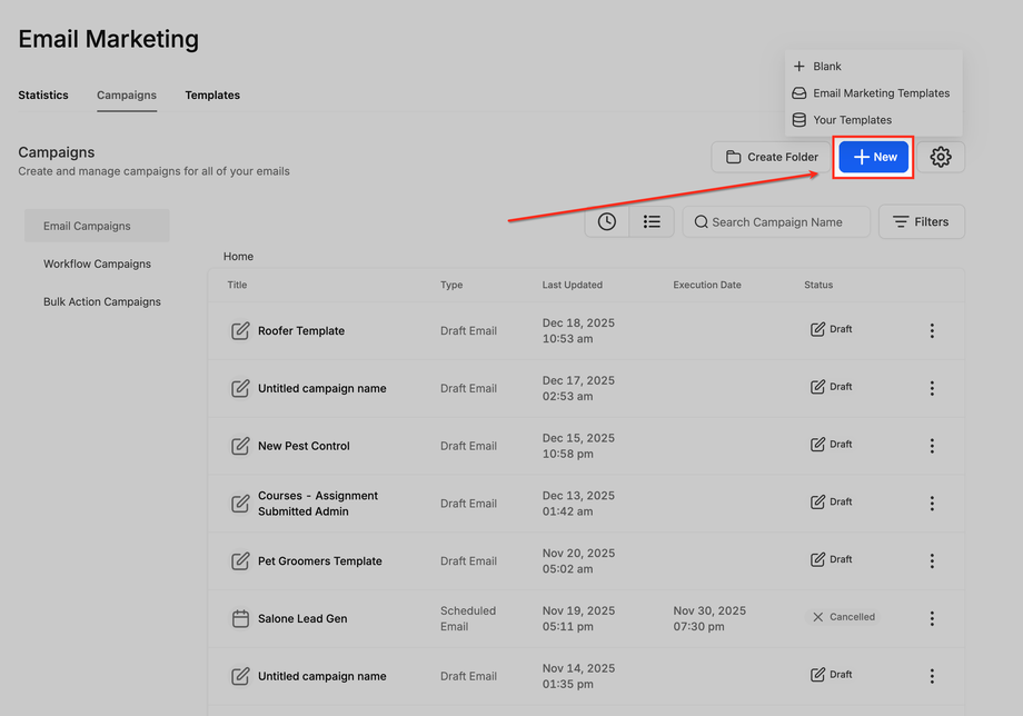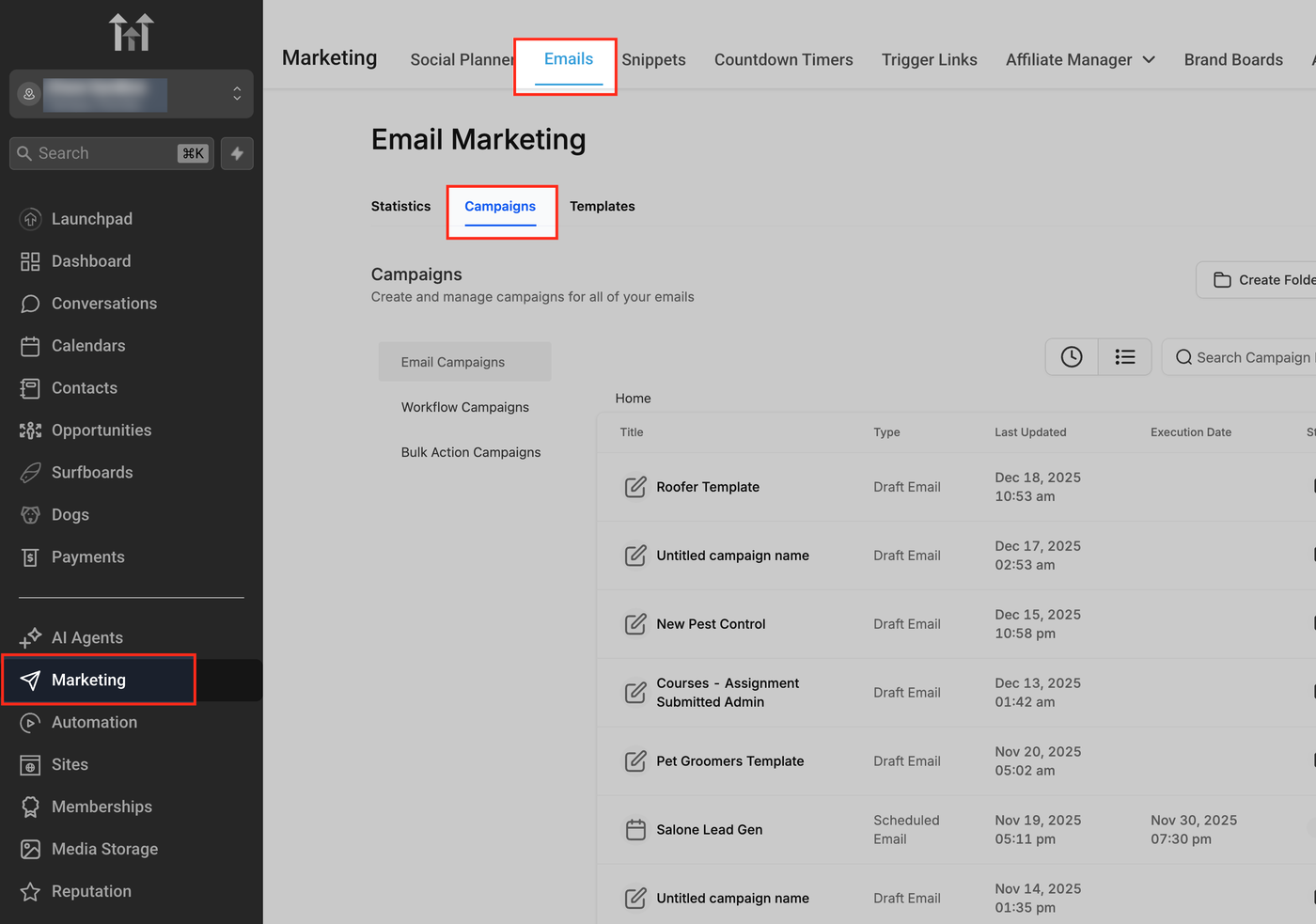 Gehen Sie zu Marketing → E-Mails → Kampagnen
