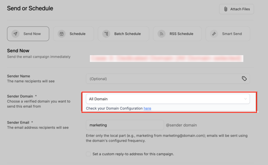 Die Auswahl der Absender-Domain erfolgt automatisch beim Senden oder Planen einer Kampagne. Es gibt keine separate Einstellung, die im Voraus aktiviert werden muss.