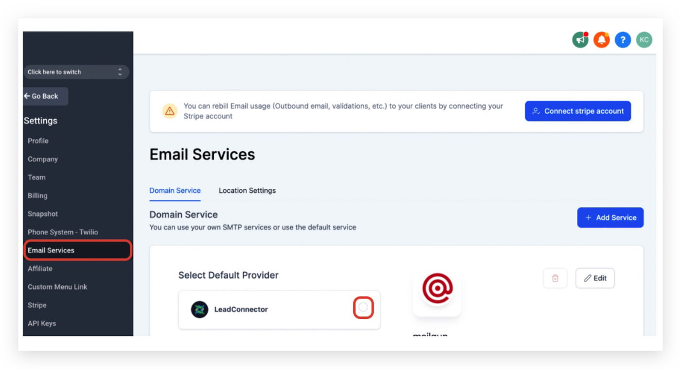 Gehe zu deinen Agency Settings > Email Services. Wenn du dort die Schaltfläche „Use LC - Email“ siehst, wähle LeadConnector als Default Provider aus und folge den Anweisungen:
