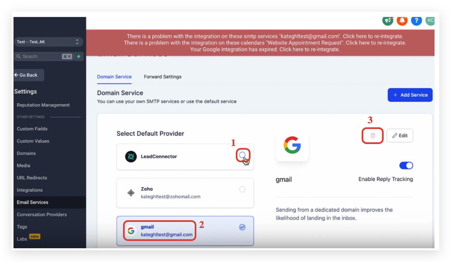Wähle LeadConnector als Default Provider aus
