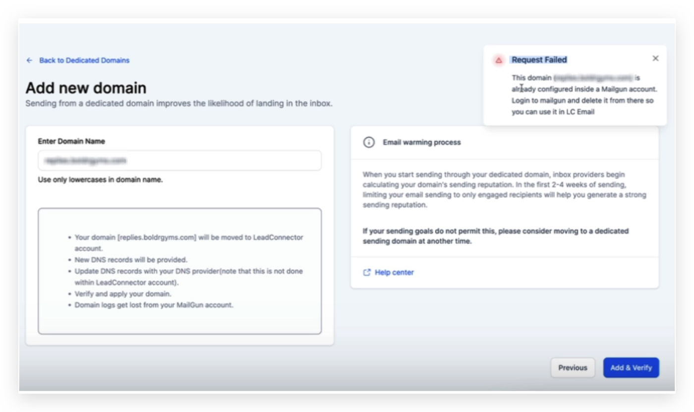 Melde dich bei Mailgun an und lösche die Domain dort, damit du sie in LC Email verwenden kannst.