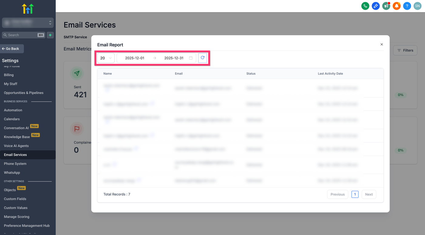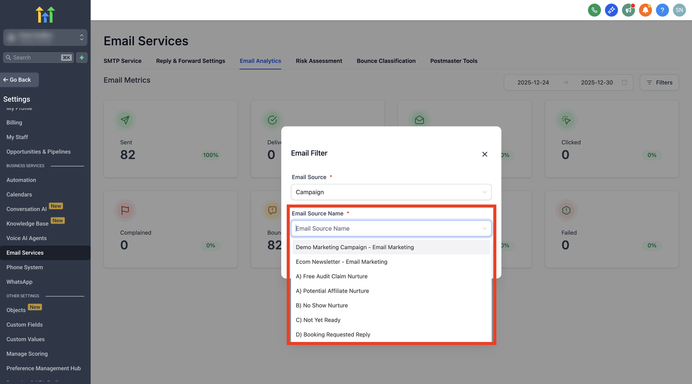 Das Filtern nach E-Mail-Statistiken konzentriert sich auf Analysen auf Kontaktebene in ProfitBoost. Sub-Accounts können Kontakte anhand der E-Mail-Performance (z. B. Opened, Clicked, Bounced) filtern, um das Engagement zu verstehen und Maßnahmen zu ergreifen.