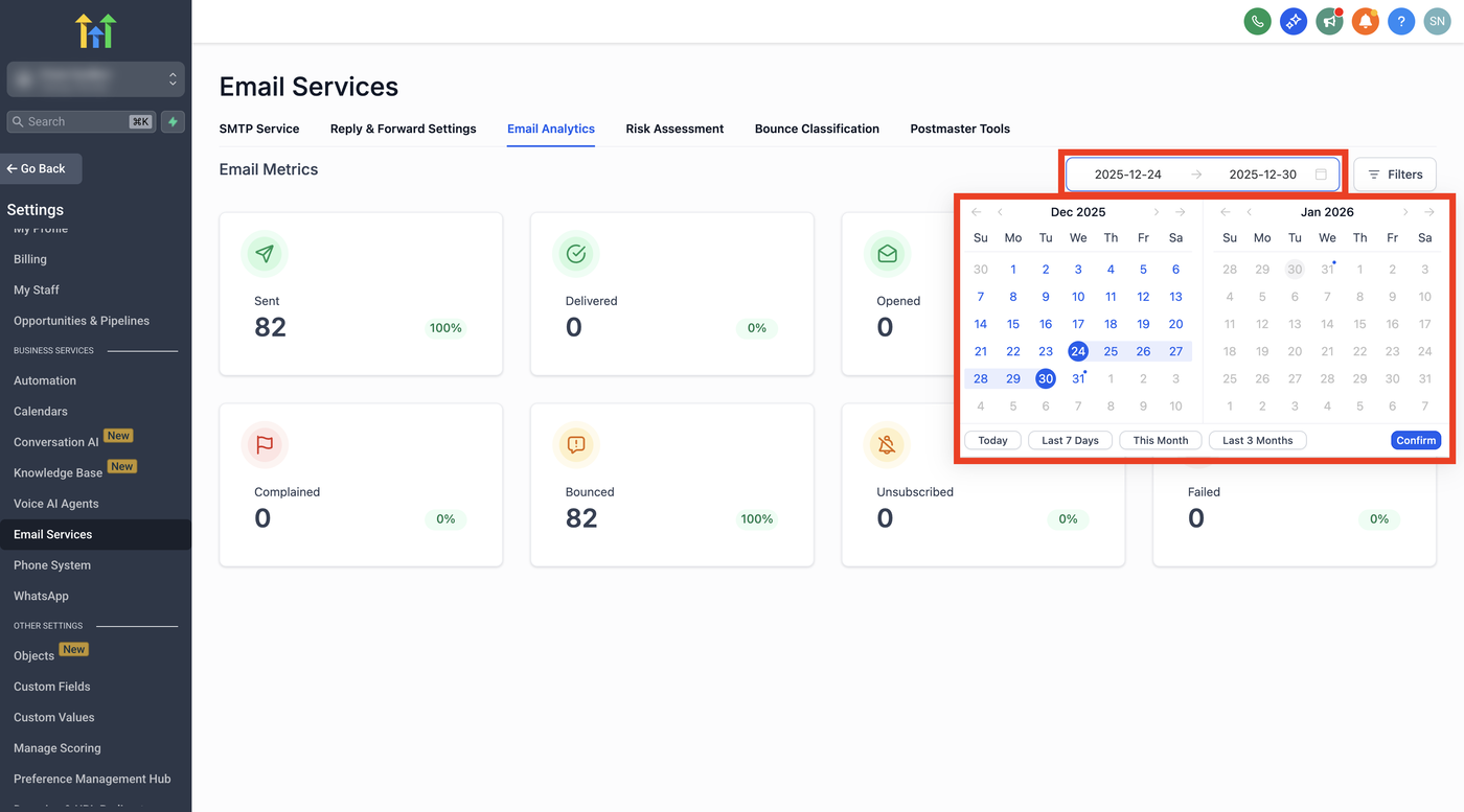 A: Verwende den Date-Range-Picker oben in Email Analytics und klicke auf Refresh, um ihn anzuwenden.