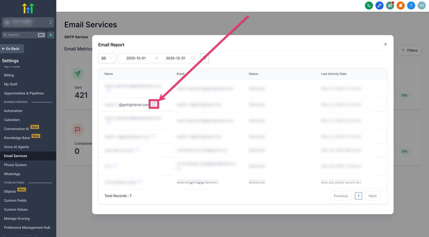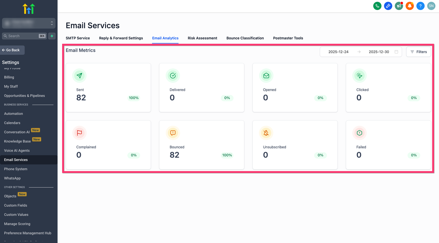 Gehe zu Settings → Email Services → Email Analytics.