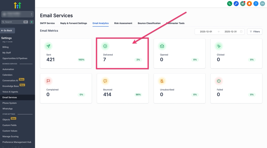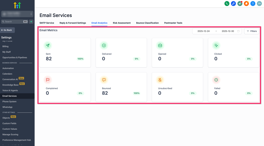 Überprüfe die E-Mail-Kennzahlen (Sent, Delivered, Opened, Clicked, Complained, Bounced, Unsubscribed, Failed).