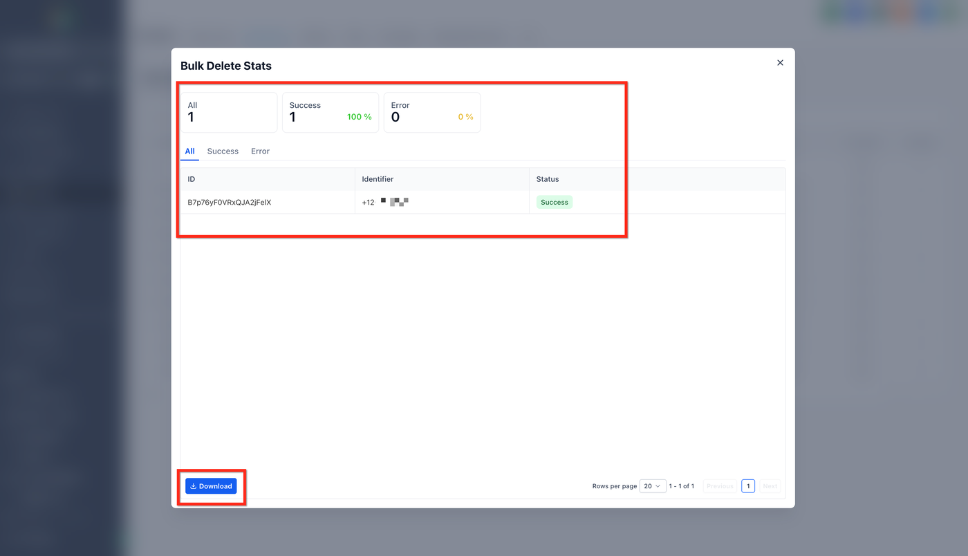 Nutze in der Stats-Ansicht die Option Download, um ein Fehlerprotokoll zur Fehleranalyse zu exportieren. Das Protokoll enthält in der Regel Kennungen fehlgeschlagener Datensätze und einen handlungsrelevanten Grund.