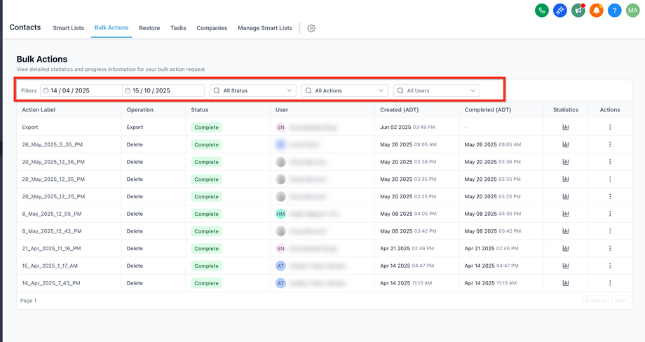 Die Bulk-Actions-Seite ist ein zentrales Dashboard, das alle Massenaktionen auflistet, die aus den Kontakten heraus gestartet wurden (z. B. Importe, Tag-Aktualisierungen, Massen-Nachrichtenversand und Löschungen). Sie stellt Live-Status, Ergebniskennzahlen und Zugriff auf detaillierte Protokolle bereit, damit Teams Ergebnisse schnell überprüfen und Probleme beheben können.