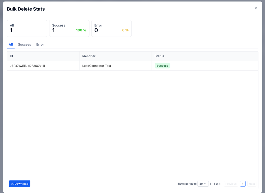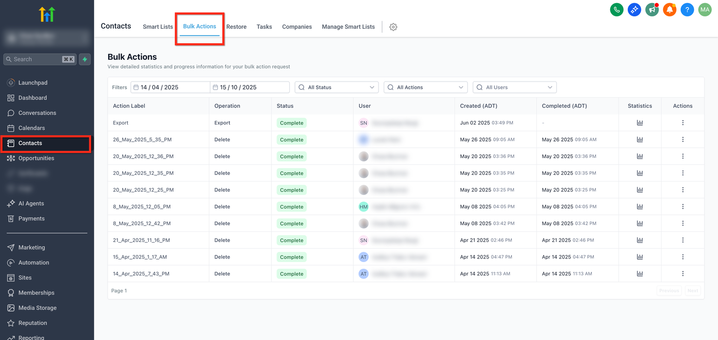 Die Seite „Bulk Actions“ verwendet jetzt die einheitliche HighLevel-UX, die schnelleres Filtern, eine klarere Statusverfolgung und den Ein-Klick-Zugriff auf Job-Metriken und Fehlerprotokolle ermöglicht – damit du Massenvorgänge sicher prüfen, Fehler beheben und (falls zutreffend) gelöschte Kontakte zuverlässig wiederherstellen kannst.