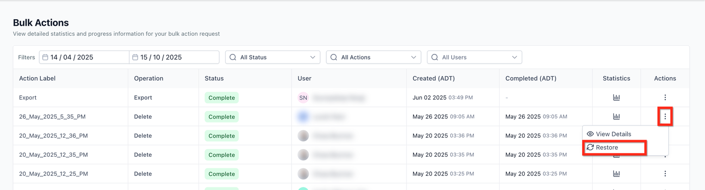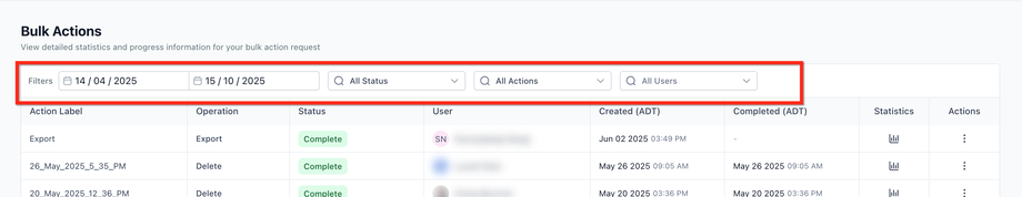 Die Seite zeigt jeden Massenjob in einer Tabelle mit Spalten wie Action Name, Action Type, Created By, Created At und Status. Von hier aus kannst du Show Stats öffnen, um detaillierte Ergebnisse zu sehen, oder das Aktionsmenü der jeweiligen Zeile für Verwaltungsoptionen nutzen (z. B. Pausieren/Abbrechen für berechtigte Jobs sowie Wiederherstellen bei unterstützten Löschjobs).