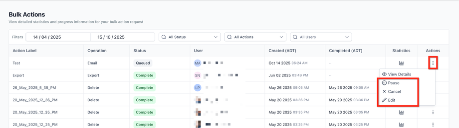 Für berechtigte Jobtypen (z. B. geplante Bulk-SMS) nutze das Drei-Punkte-Menü der Zeile, um Pause, Edit oder Cancel auszuführen. Bereits vor dem Abbruch verarbeitete Elemente bleiben abgeschlossen.