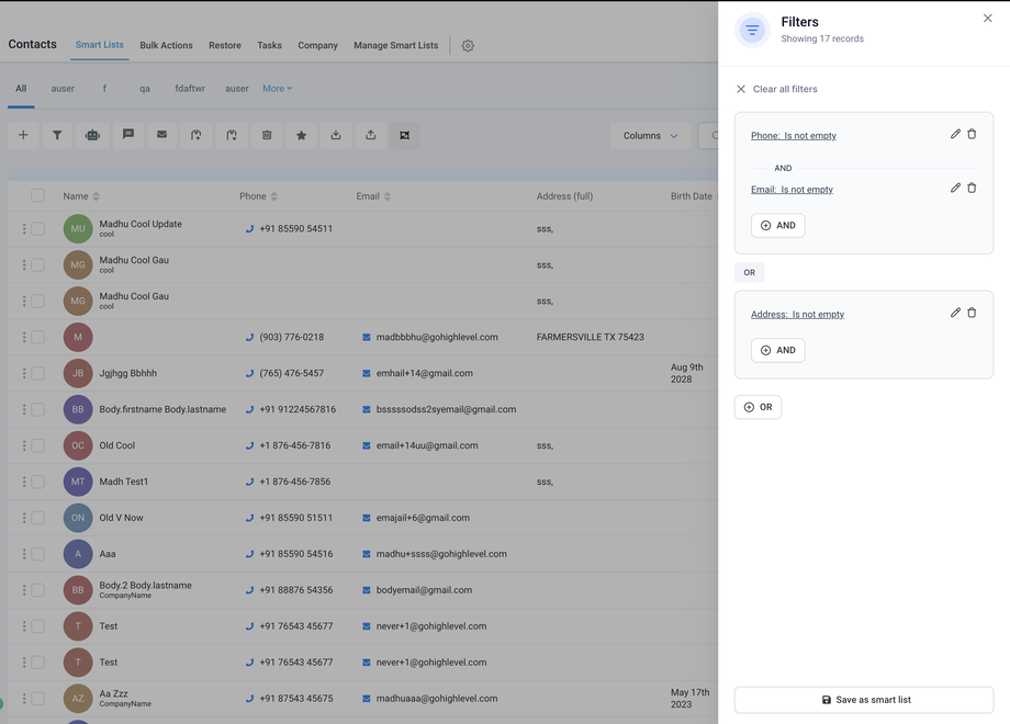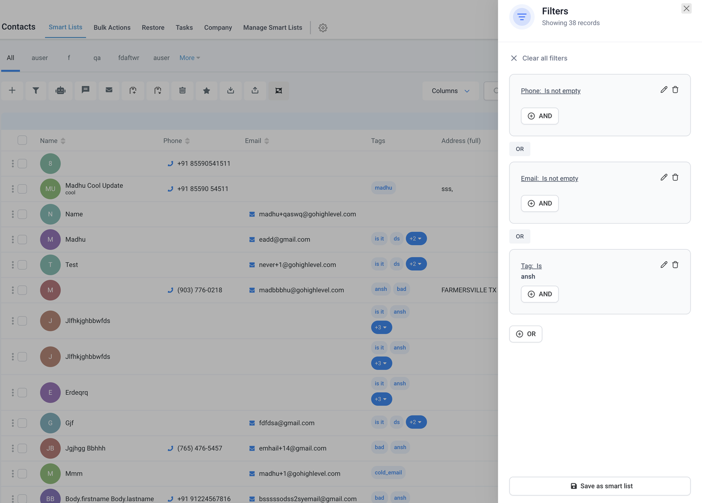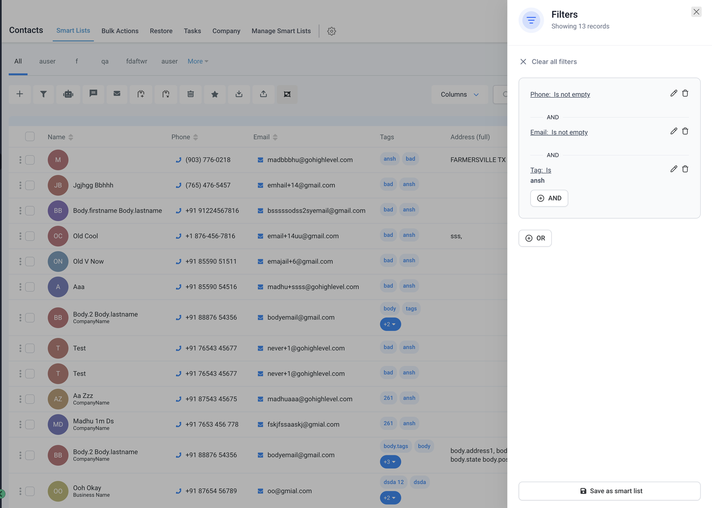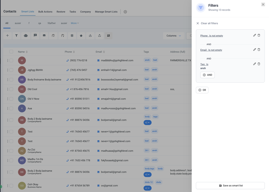 Beispiel: Kontakte mit einem bestimmten Tag, die außerdem sowohl eine E-Mail UND eine Telefonnummer haben