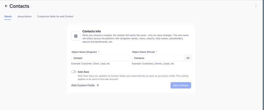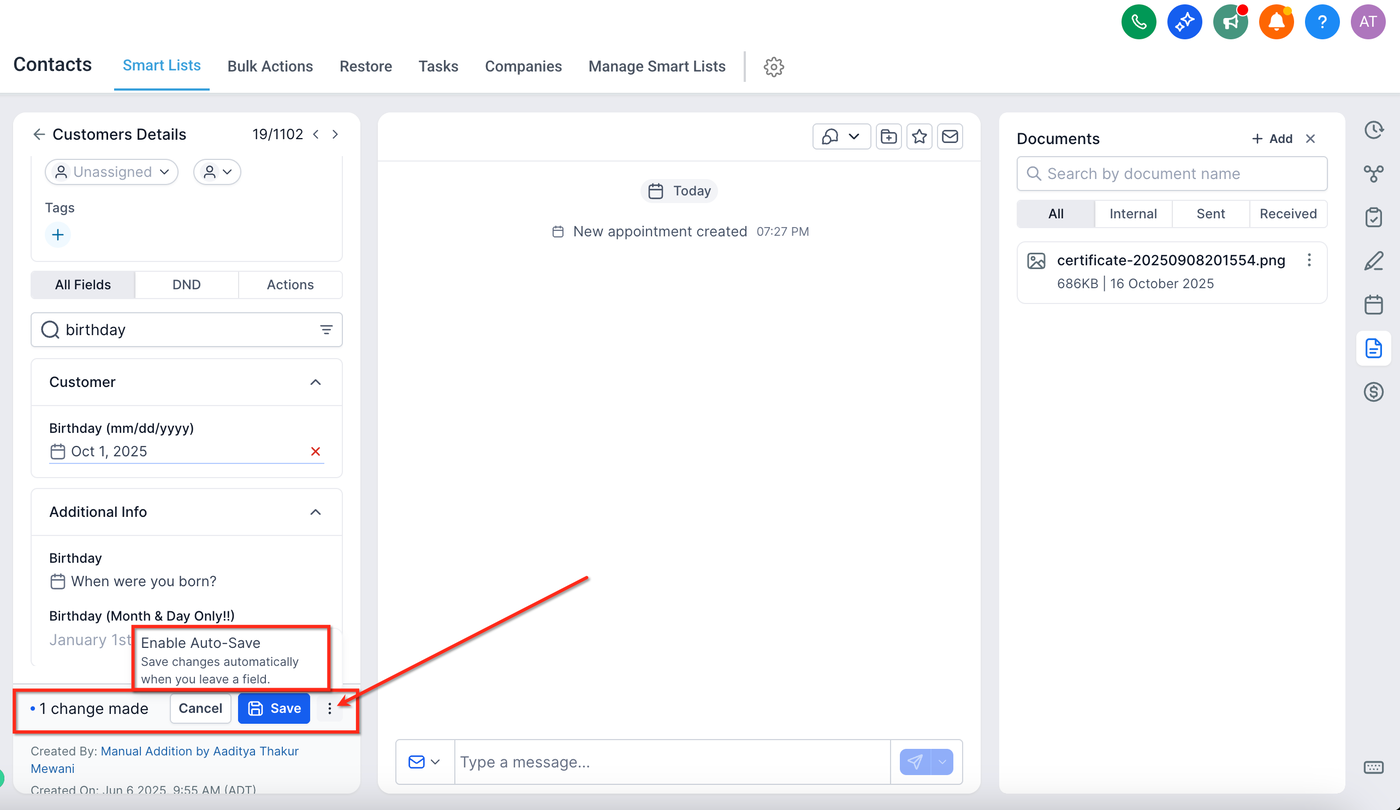 Administratoren können Auto-Save auch unter Einstellungen → Kontakte → Details Tab → Auto-Save Toggle aktivieren oder deaktivieren.