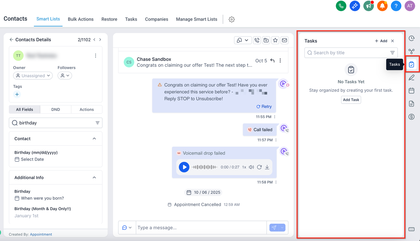 Aufgaben — Erstellen, bearbeiten oder abhaken von kontaktbezogenen Aufgaben.