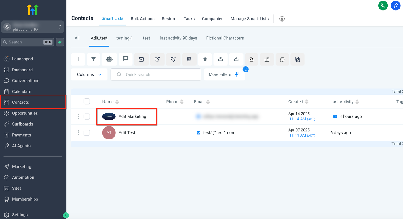 Nach dem Erstellen eines Kontakts mit Profilbild navigieren Sie zurück zur Contacts Smart List. Dort sehen Sie das hochgeladene Bild neben dem Kontaktnamen, was die visuelle Suche und Identifizierung erleichtert.