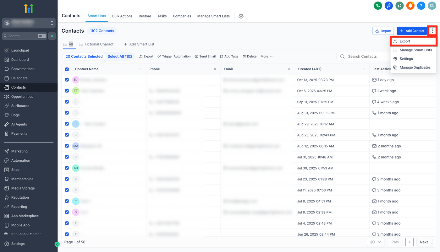 Die Export-Funktion ermöglicht es, HighLevel-Kontakte in eine CSV-Datei herunterzuladen. Die exportierte Datei enthält wichtige Informationen wie Name, E-Mail-Adresse, Telefonnummer, Tags und benutzerdefinierte Felder (sofern ausgewählt). Anwendungsfälle: