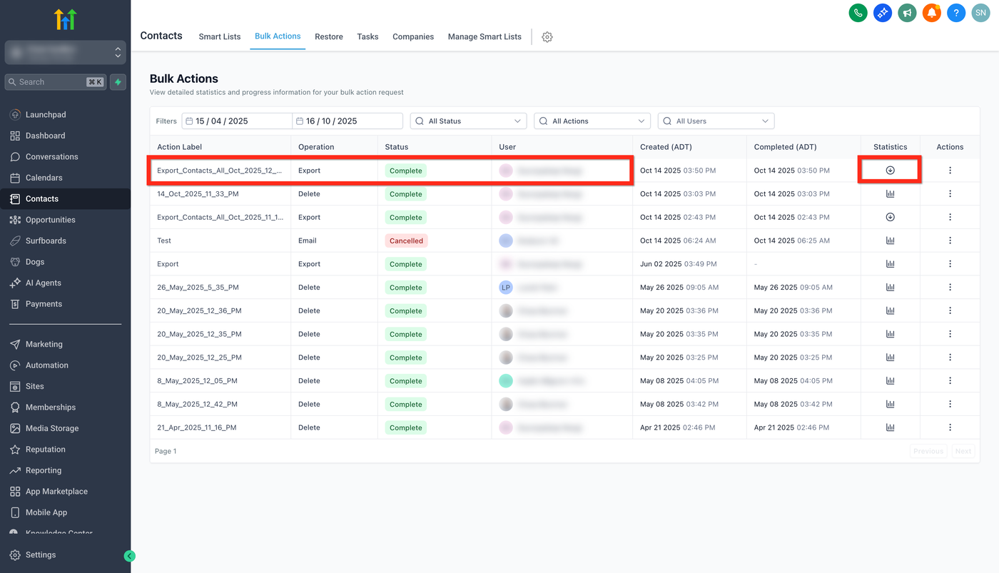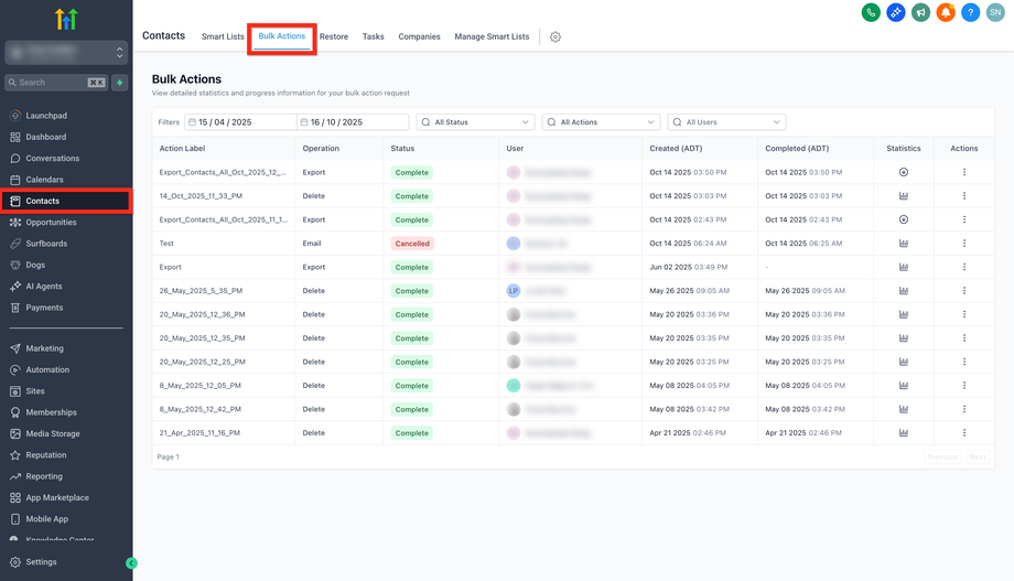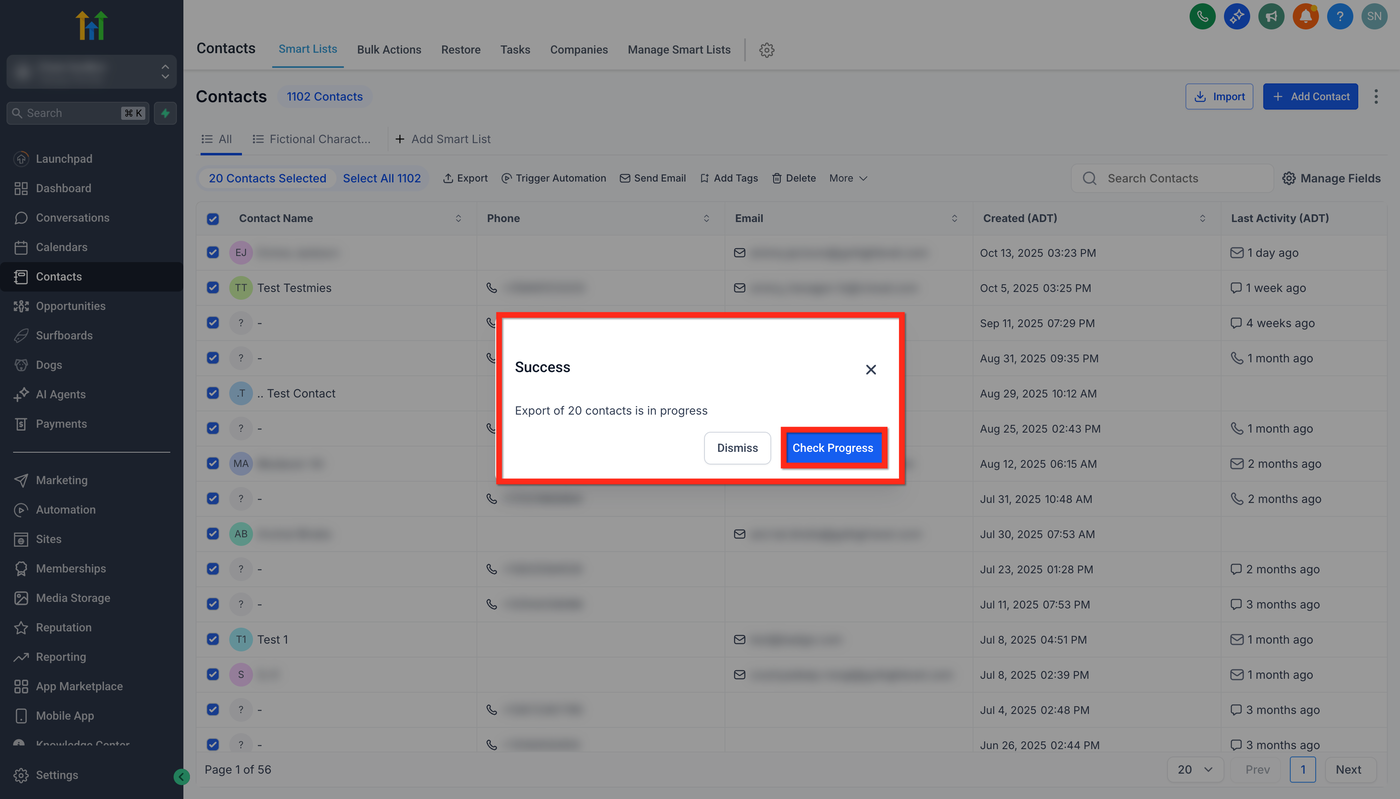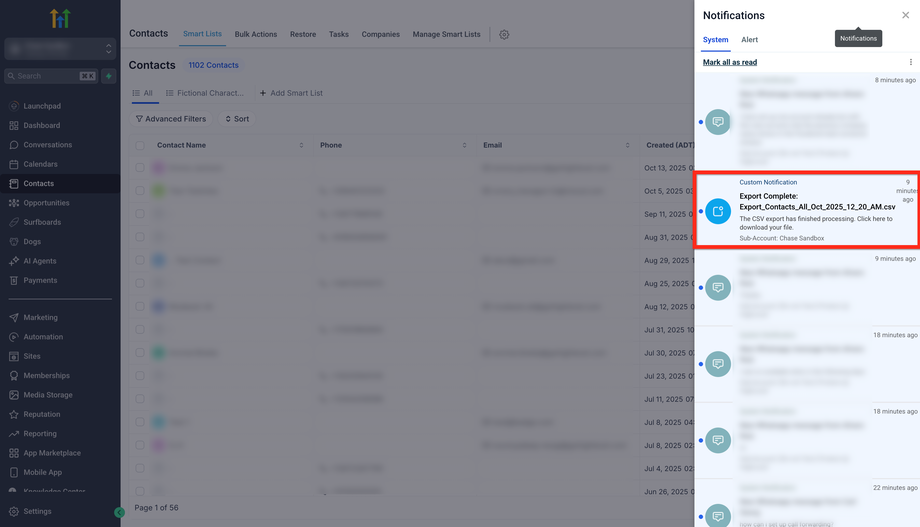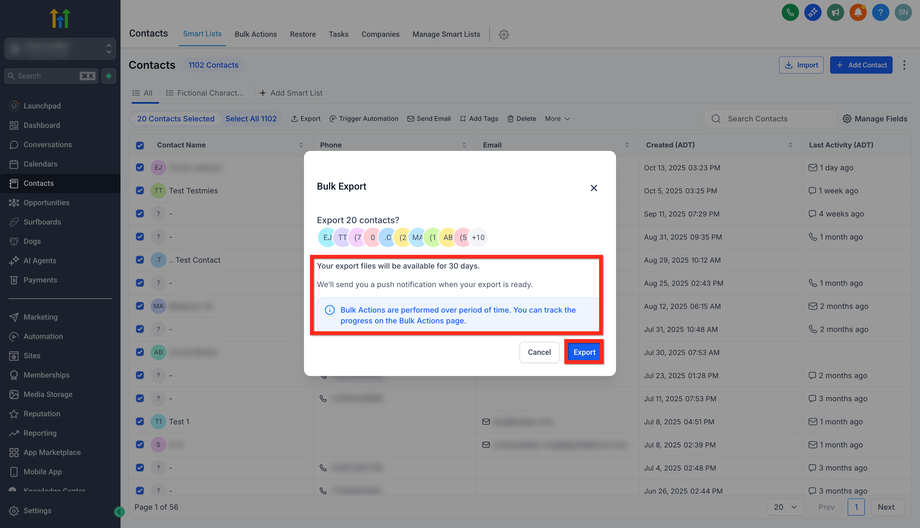 Das Kontakte-Export-Upgrade ersetzt den alten, browserbasierten Export durch einen skalierbaren Backend-Service. Statt darauf zu warten, dass eine CSV-Datei im Vordergrund heruntergeladen wird, wird Ihr Exportauftrag auf den Servern von HighLevel in die Warteschlange gestellt, parallel verarbeitet und in Echtzeit über das Dashboard „Bulk Actions“ verfolgt. Nach Abschluss steht eine fertige, herunterladbare Datei in Bulk Actions zur Verfügung und ist 30 Tage lang abrufbar.