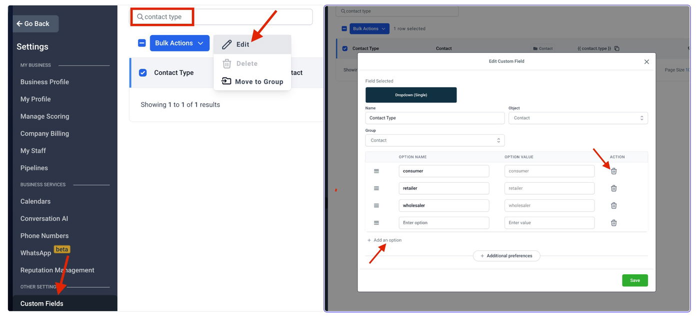 So fügen Sie Kontakttypen hinzu, bearbeiten oder löschen sie über den Bereich Custom Fields: