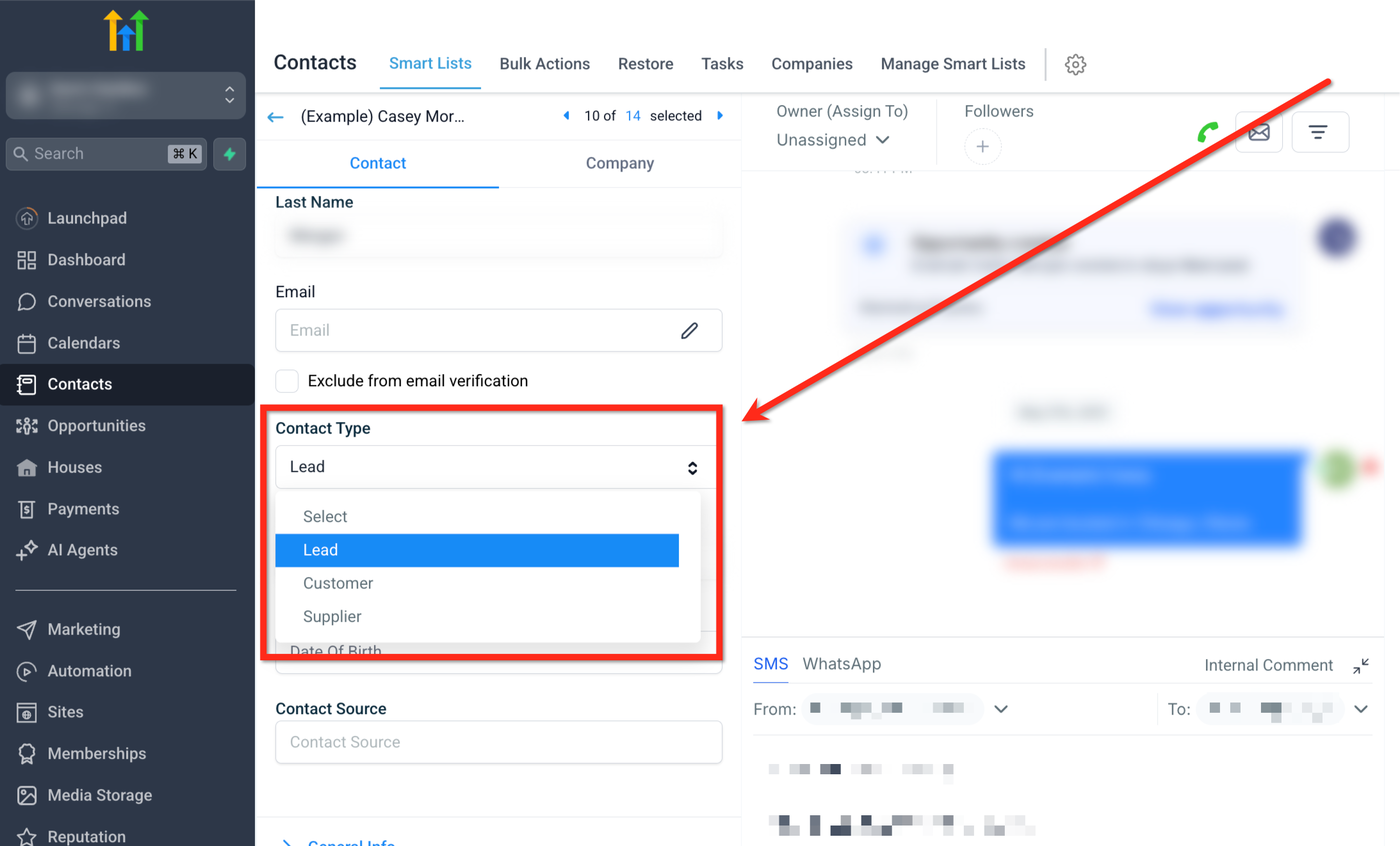 Dieser Artikel erklärt, wie man Kontakttypen in HighLevel einrichtet und verwendet, um Kontakte besser zu segmentieren und zu verwalten. Kontakttypen sind Dropdown-Felder, die definieren, welche Art von Beziehung Sie zu einem Kontakt haben, z. B. „Lead“, „Kunde“ oder „Interessent“.