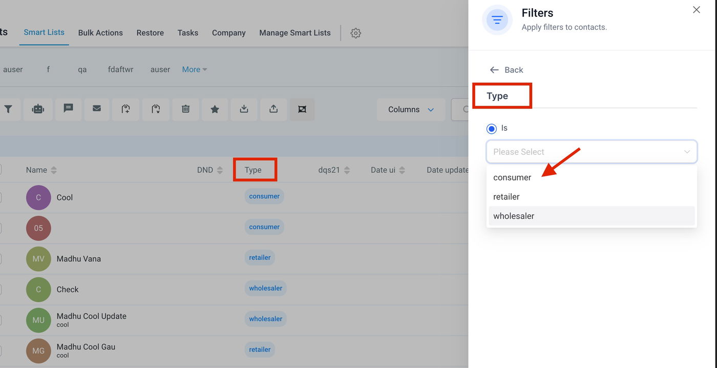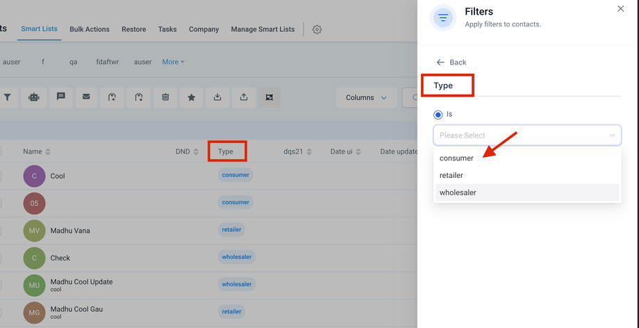 A: Ja. Nutzen Sie die Bulk-Action-Funktion in Smart Lists, um die Aktion Kontaktfeld aktualisieren auf mehrere Kontakte anzuwenden und einen neuen Kontakttyp zu setzen.