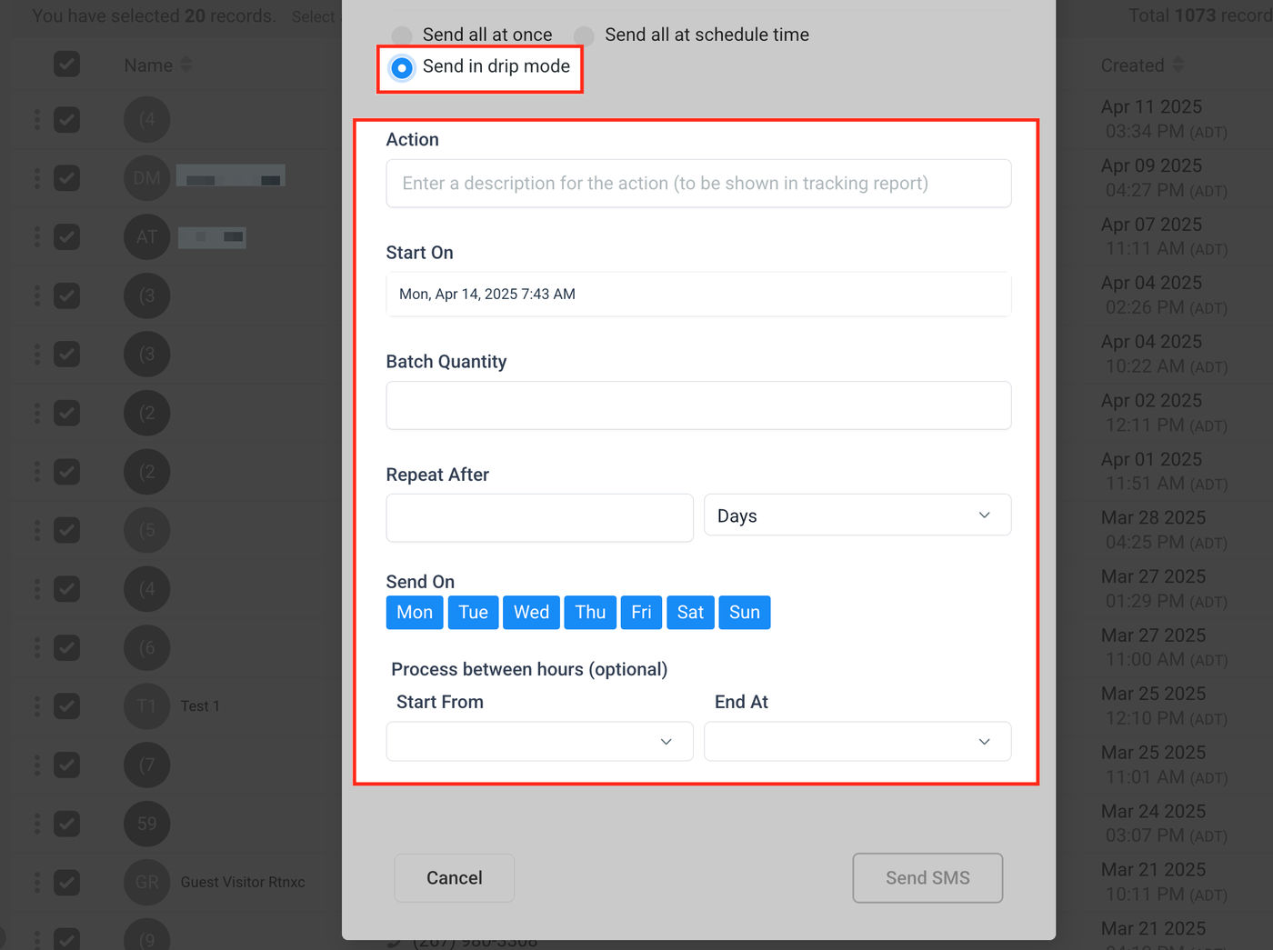 Wählen Sie unter Delivery Method die Option Send in Drip Mode. Dadurch wird die Aktion schrittweise in Batches ausgeführt und nicht auf einmal.