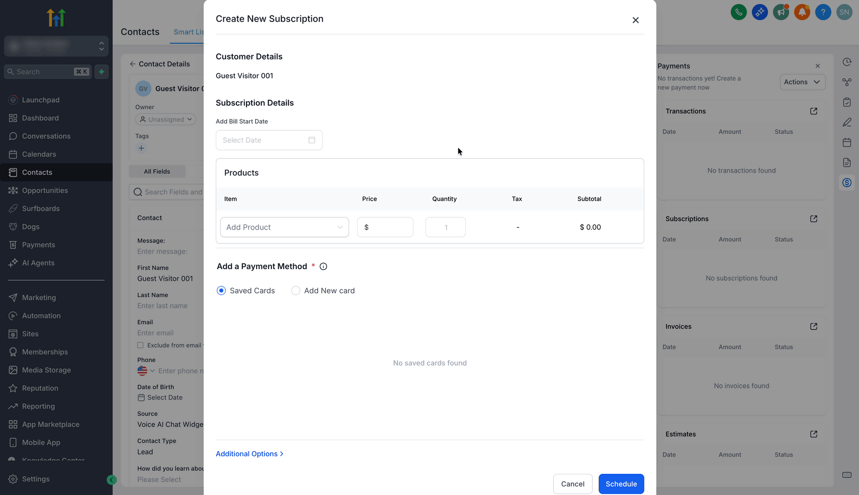 Diese neue Funktion vereinfacht die Abrechnung, indem Unternehmen Abonnements und Rechnungen für einen bestimmten Kontakt erstellen können, ohne diesen Kontakt in einem anderen Bereich der App suchen zu müssen! Dieser Leitfaden erklärt, wie Sie Abonnements und Rechnungen direkt über Kontaktdetails > Zahlungen erstellen können.