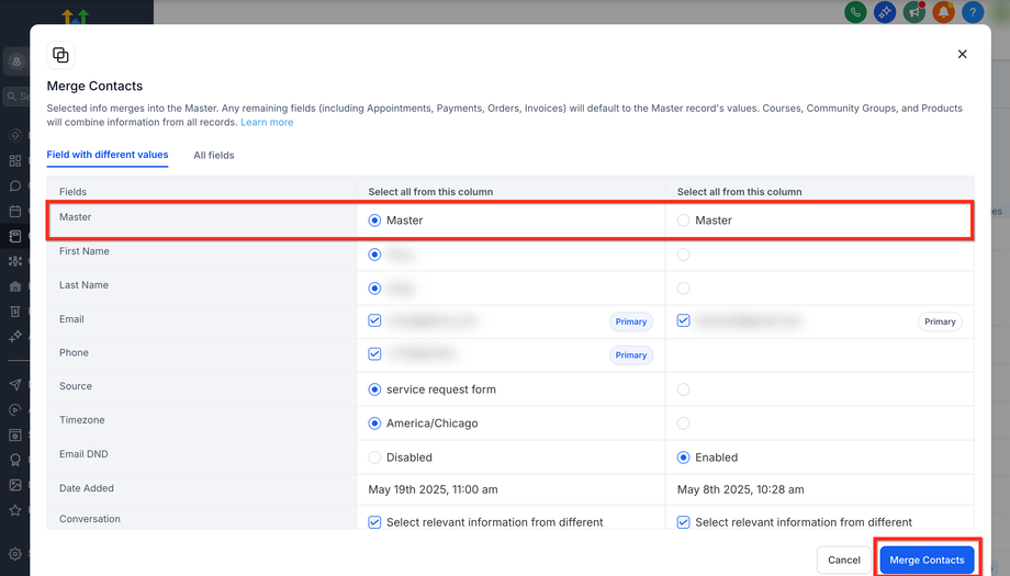 Optional: Wählen Sie die primäre E-Mail/Telefonnummer für den Master-Kontakt aus einem der ausgewählten Kontakte aus.