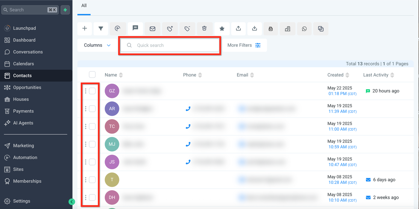 Navigieren Sie im HighLevel-Sub-Account zu „Kontakte“.