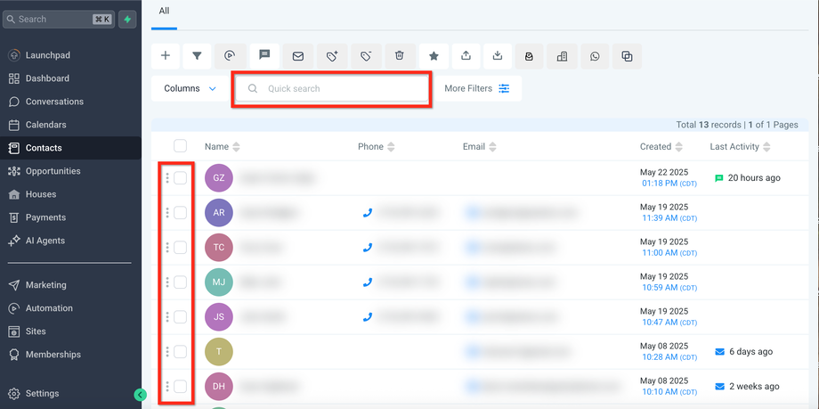 Verwenden Sie die QuickSearch-Leiste, um doppelte Kontakte anhand gemeinsamer Identifikatoren wie Name oder E-Mail zu finden.