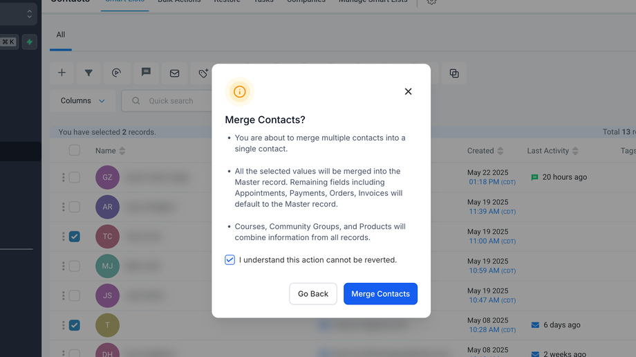 Das Zusammenführen doppelter Kontakte in HighLevel ermöglicht es Ihnen, mehrere Einträge derselben Person oder Firma zu einem einzigen, einheitlichen Kontakt zusammenzufassen. Dies hilft, Verwirrung zu reduzieren, redundante Kommunikation zu vermeiden und eine saubere Kontaktdatenbank zu gewährleisten.