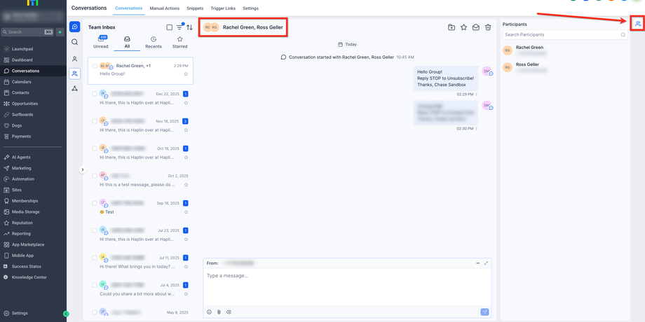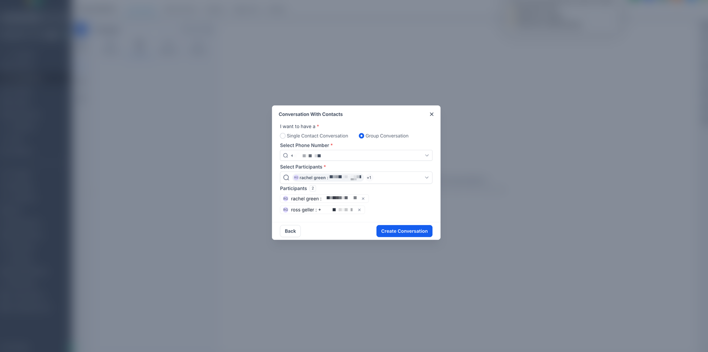 Wählen Sie Group Conversation, wählen Sie Ihre Absendernummer, fügen Sie 2–9 Teilnehmer hinzu und klicken Sie dann auf Create Conversation.