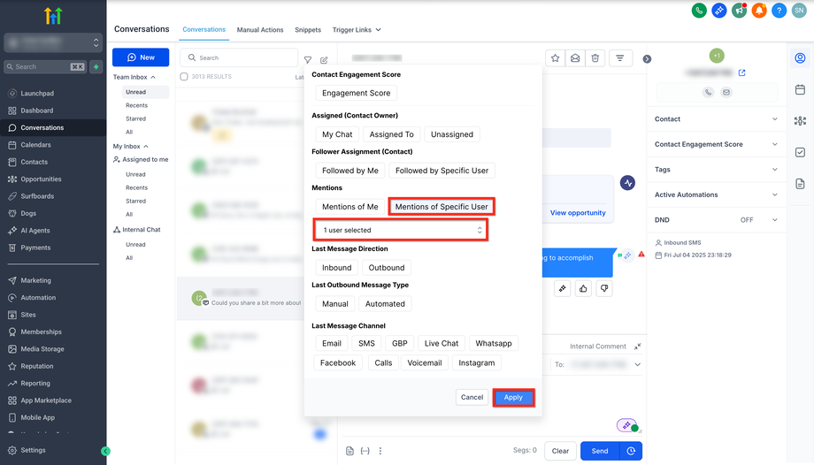 Oder wähle Erwähnungen eines bestimmten Benutzers, wähle den Benutzer aus der Liste und klicke auf Anwenden, um Konversationen anzuzeigen, in denen dieser Benutzer erwähnt wurde.