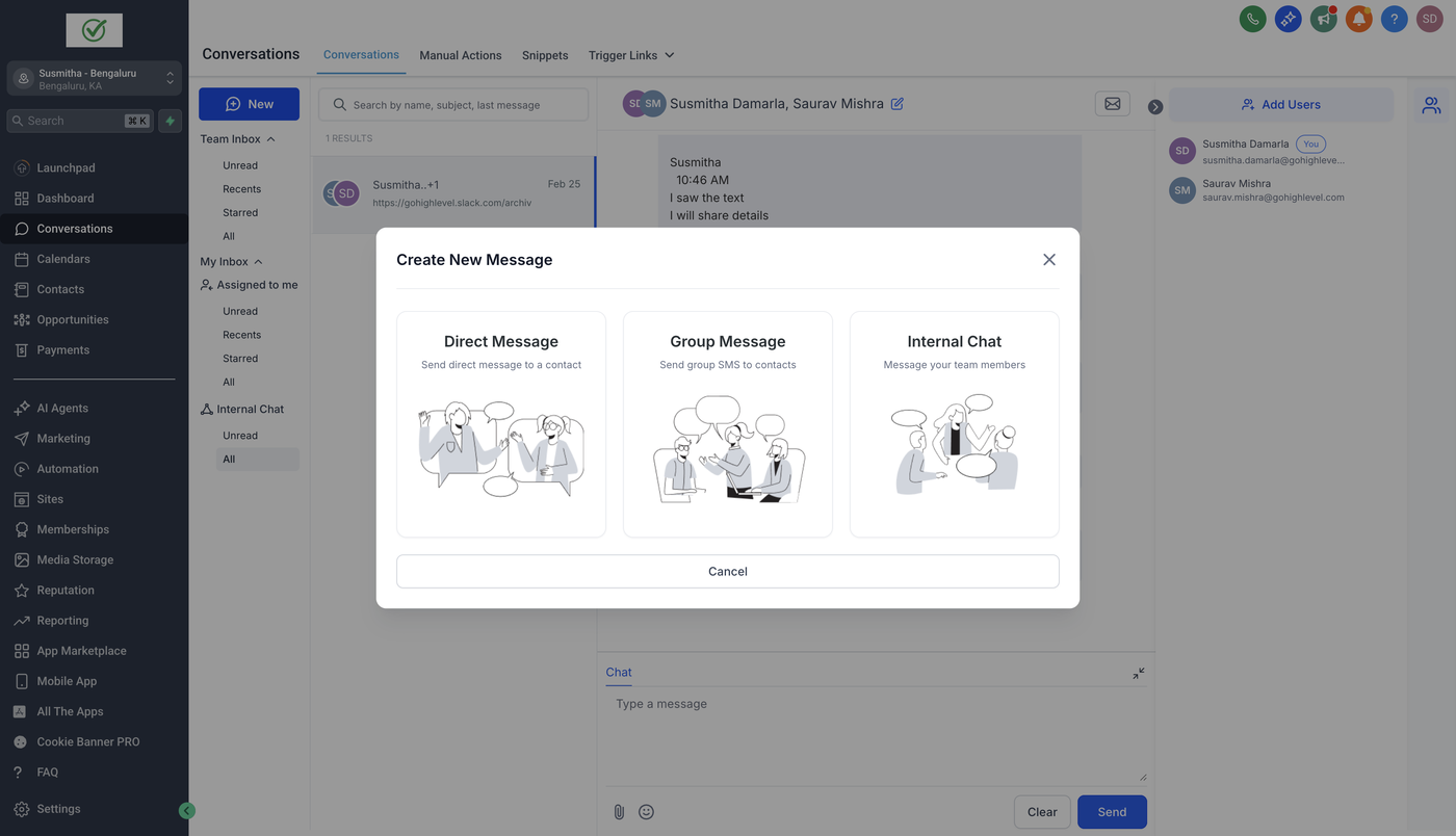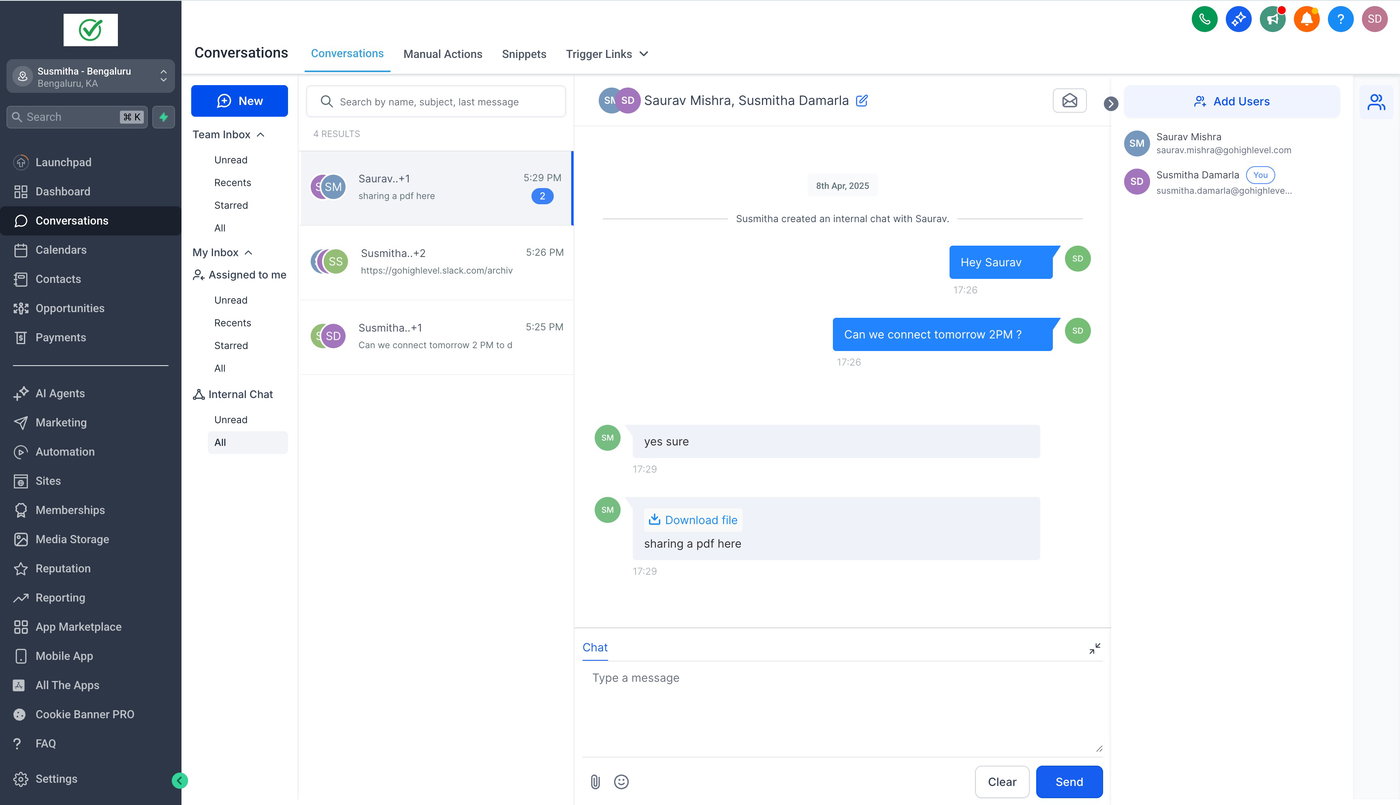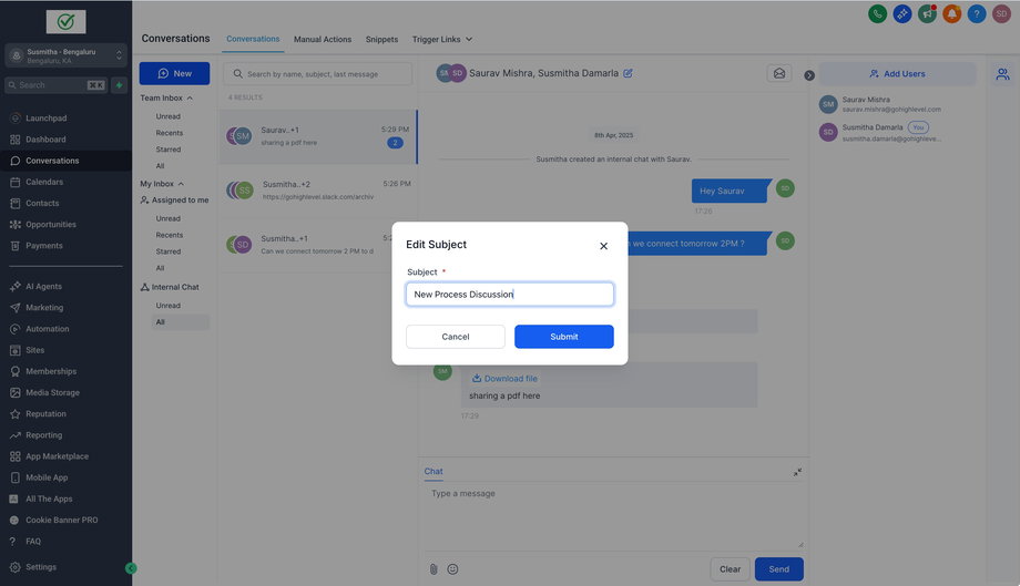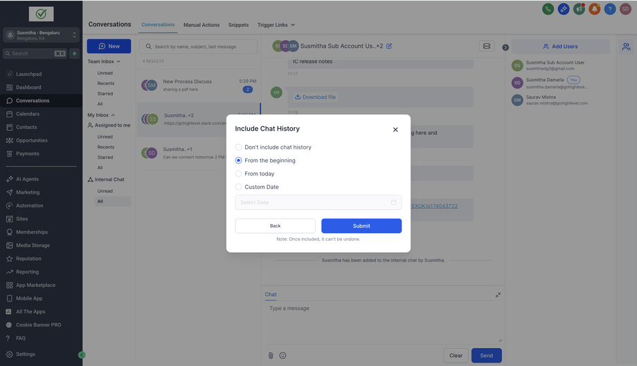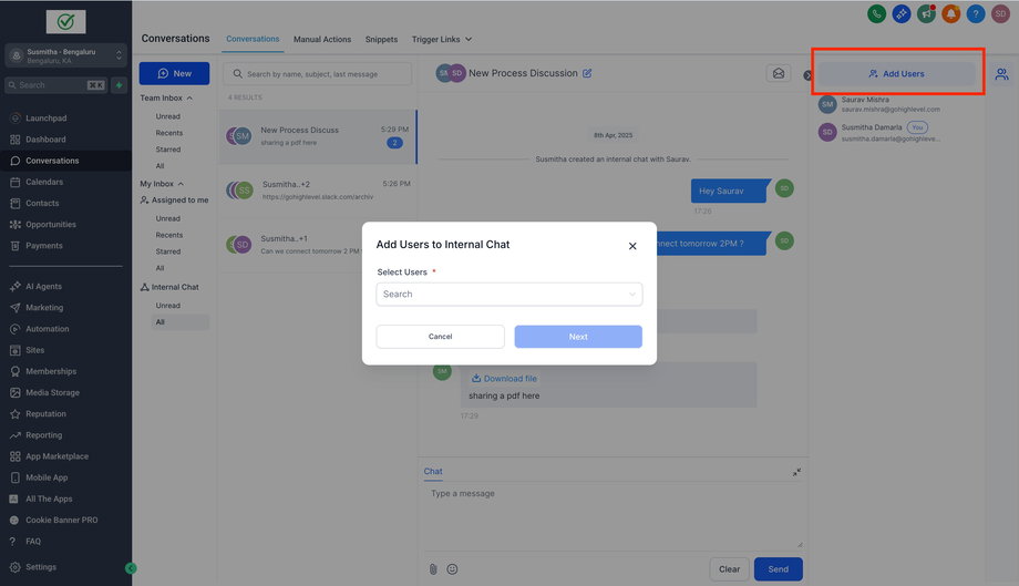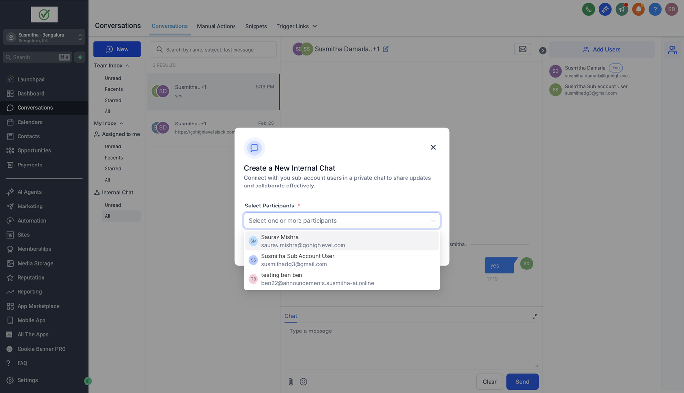 Internal Chat ermöglicht es Benutzern, privat mit anderen Benutzern ihres Unterkontos innerhalb des Conversations-Moduls zu kommunizieren. Dies erleichtert Diskussionen und verbessert die interne Zusammenarbeit. Im Gegensatz zu Kontaktgesprächen sind interne Chats nur für die Teilnehmer sichtbar, wodurch die Privatsphäre der Unterhaltungen gewährleistet bleibt.