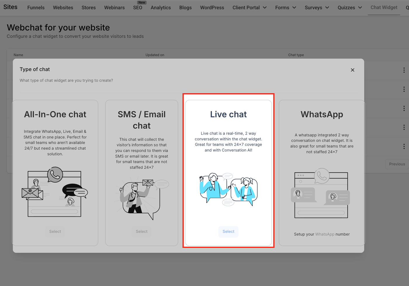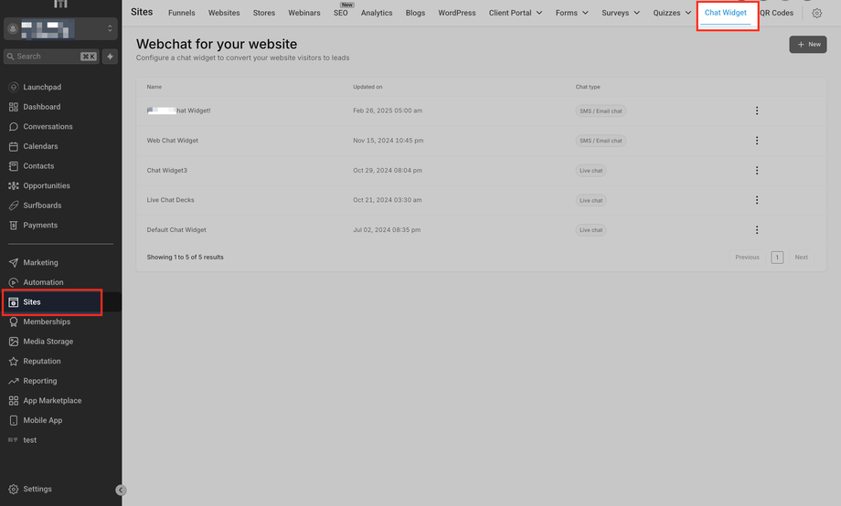 Gehe zu Sites > Chat Widget. Klicke auf + New, um ein neues Chat-Widget zu erstellen.