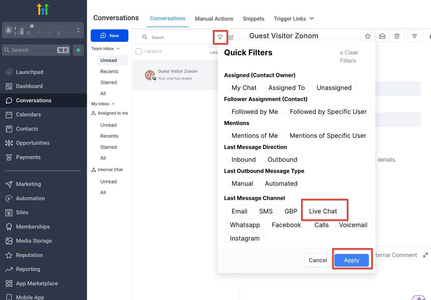 A: Ja, die Filteroption innerhalb der Conversations-Sektion erlaubt es, nur Live-Chat-Nachrichten anzuzeigen. Dies erleichtert die Verwaltung von Echtzeit-Interaktionen getrennt von SMS, E-Mail und anderen Kommunikationskanälen.