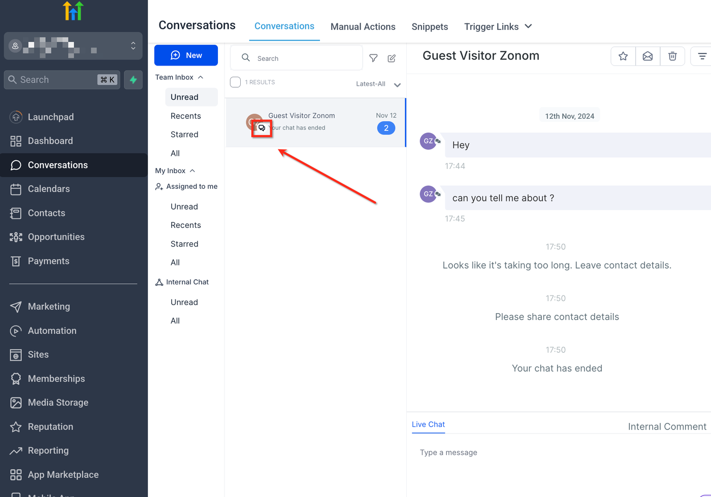 Nachrichten aus dem Website-Chat-Widget werden direkt in die Conversations-Sektion geleitet, wo Benutzer Interaktionen zusammen mit anderen Kommunikationskanälen wie SMS und E-Mail verwalten können. Diese Zentralisierung hilft, Workflows zu optimieren und eliminiert die Notwendigkeit, zwischen mehreren Plattformen zu wechseln. Zusätzlich können Unternehmen Chats bestimmten Teammitgliedern zuweisen, Automatisierungen nutzen, um die Effizienz zu steigern, und Fallback-Nachrichten für unbeantwortete Anfragen konfigurieren. Mit Live-Chat können Unternehmen ein nahtloses, interaktives Erlebnis bieten, das Besucher engagiert hält und die Conversion-Rate erhöht.