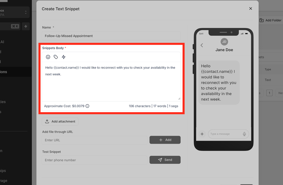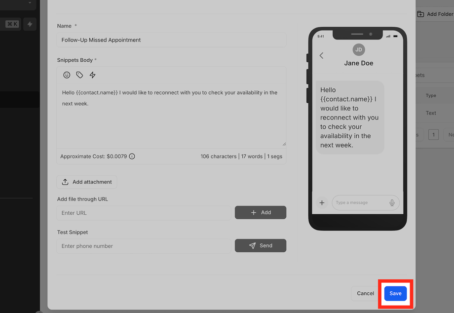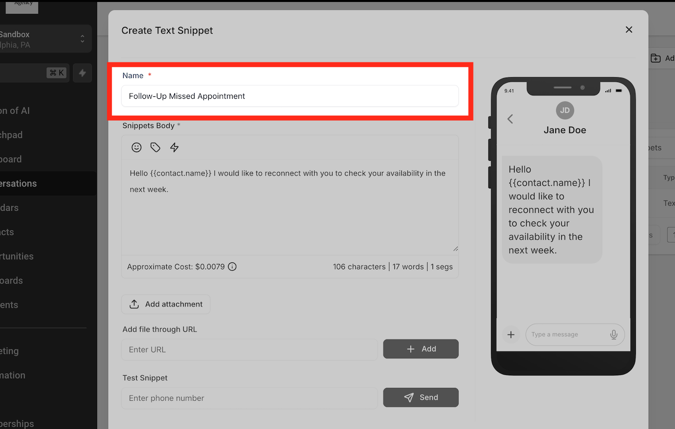Geben Sie dem Snippet einen aussagekräftigen Namen, z. B. „Follow-Up Verpasster Termin“ oder „FAQ: Öffnungszeiten“.
